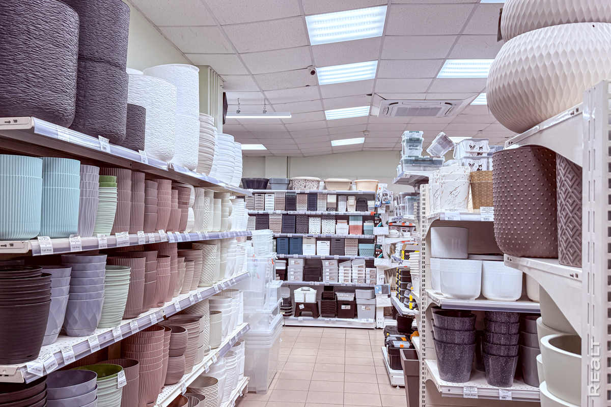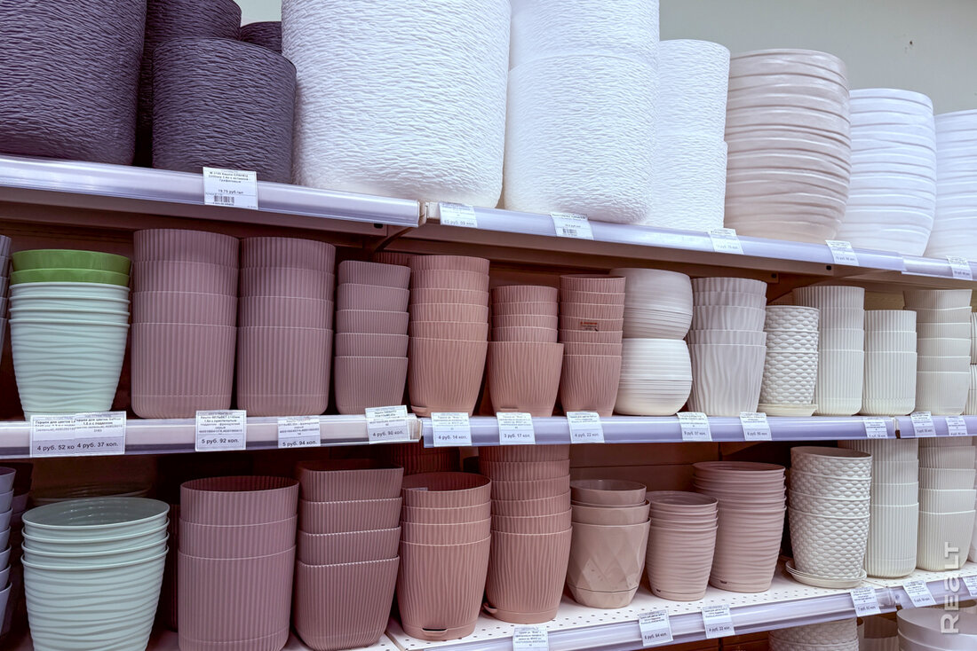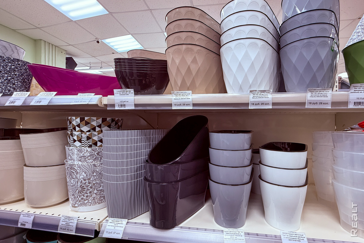 Также представлено много кашпо для цветов. Но все вазоны выполнены из пластика. Здесь же можно купить и другие товары для пересадки растений — землю, секаторы, удобрения.