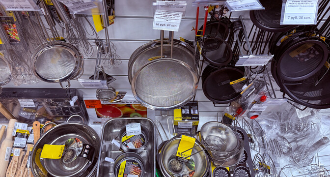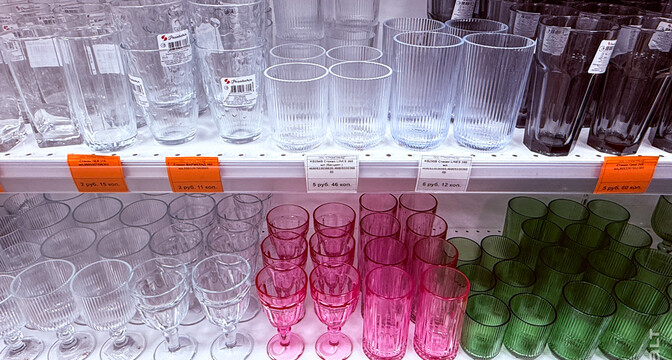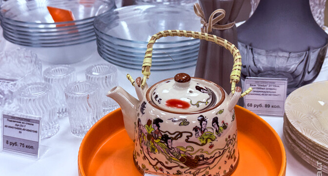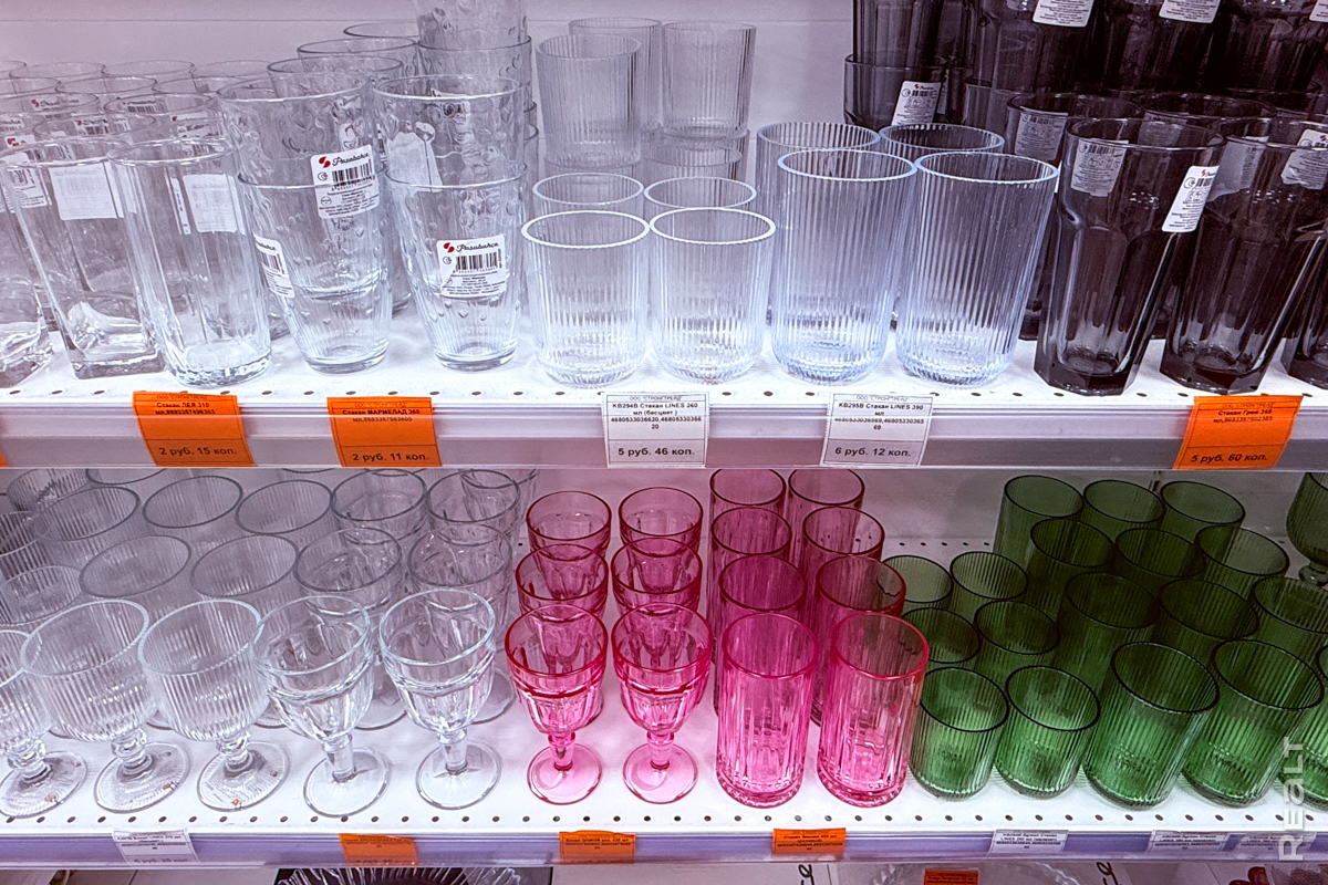 Помещение магазина достаточно большое. Товары на полках разделены по тематике. Большую часть занимает посуда и предметы для кухни. Различные бокалы от Luminarc продаются от 22 рублей, наборы стаканов Pasabahce — от 15 рублей. Гейзерная кофеварка из стали обойдется в 30 рублей, кофеварка на три чашки Bohman — почти 48 рублей. Есть разные кофейники и заварочные чайники.