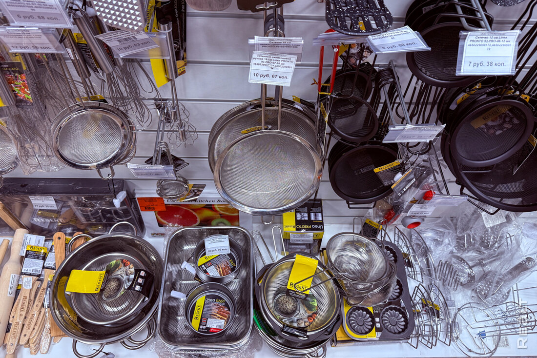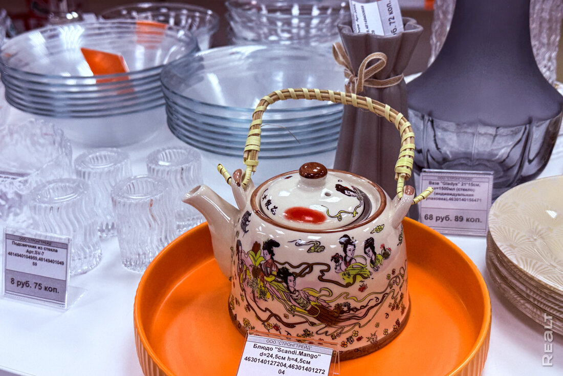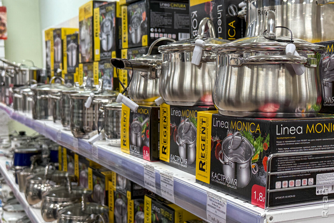 За 71 рубль можно купить чайник со свистком Regent. На маркетплейсах такую модель мы нашли от 89 рублей. От этого же бренда есть кастрюли и сковородки. Продаются и белорусские сковороды «Виктория». Некоторые стоят дешевле, чем по рынку. Так, например, сковорода «Гранит» обойдется в 63 рубля, а это почти на 20 рублей дешевле стандартной ее цены. Но есть и позиции, которые выходят, наоборот, дороже.
