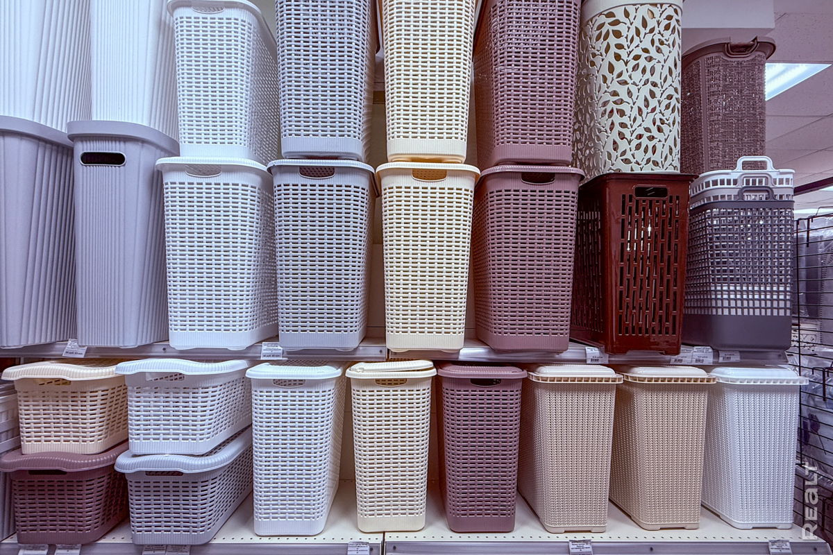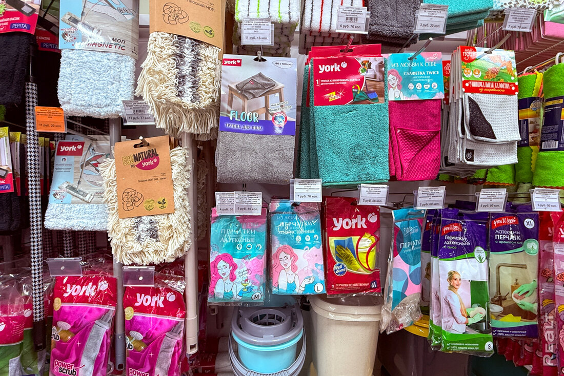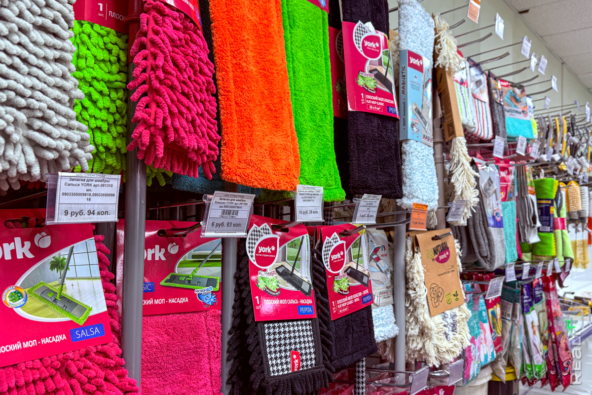 Продаются в магазине товары для уборки дома — швабры, тряпки, губки. Есть пластиковые корзины для белья и органайзеры для хранения вещей.