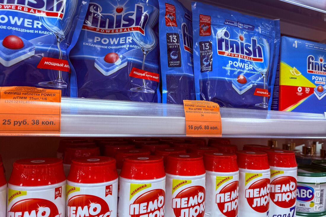Есть в ассортименте и бытовая химия. Так, например, упаковка из 13 таблеток для посудомоечной машины стоит 16 рублей 80 копеек — это не самая низкая для них цена, если сравнивать с другими магазинами. Примерно в такую же сумму обойдется и литровая бутылка отбеливателя Vanish.