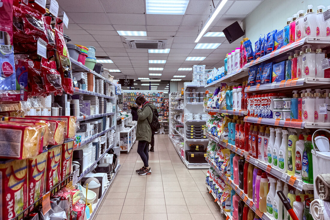 Всего сейчас работает три магазина низких цен «Красавита». Один — в Каменной Горке, второй — в Малиновке и третий в здании ТЦ «Зеркало», около Комаровского рынка. Мы отправились в третий магазин — он ближе всего к центру города, и ассортимент здесь достаточно широкий.