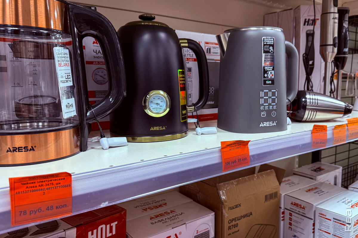 Техника, представленная в магазине, в основном, от белорусских производителей — Aresa, Holt, HiT. Есть чайники, кофеварки и кофемолки, блендеры и миксеры, вафельницы и грили. За 333 рубля можно купить профессиональную мясорубку, за 188 рублей — сушилку для овощей и фруктов. Во 127 рублей обойдется увлажнитель воздуха, а в 134 рубля пароочиститель.