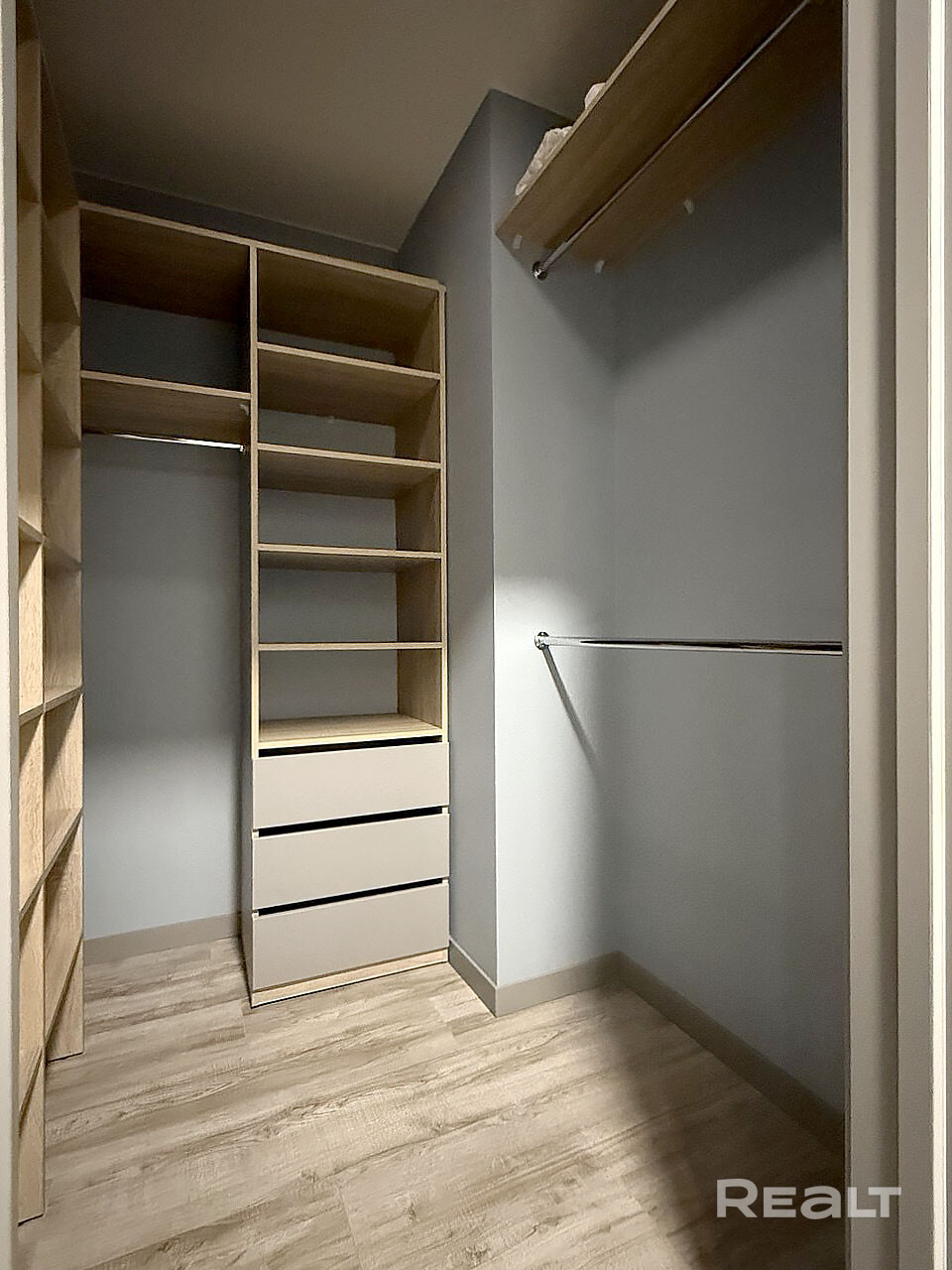 Также в квартире организовали вместительную гардеробную комнату с выдвижными полками, стеллажами и штангами.