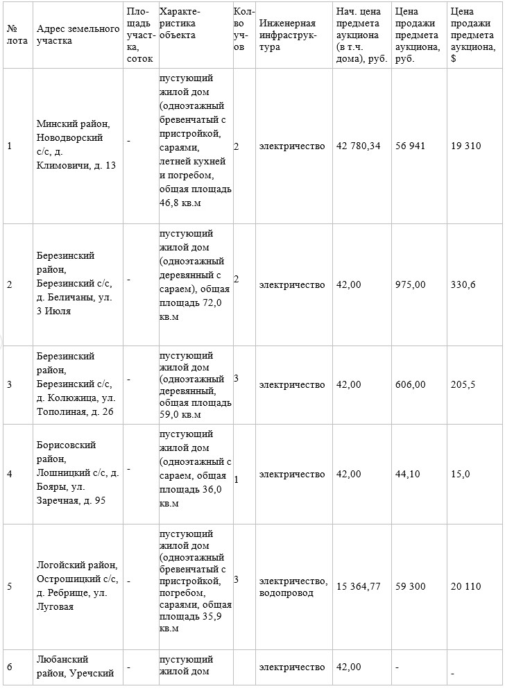 Итак, участникам аукциона было предложено 15 лотов — пустующих жилых домов в Минском (1), Березинском (2), Борисовском (1), Логойском (1), Любанском (1) и Слуцком (9) районах Минской области.