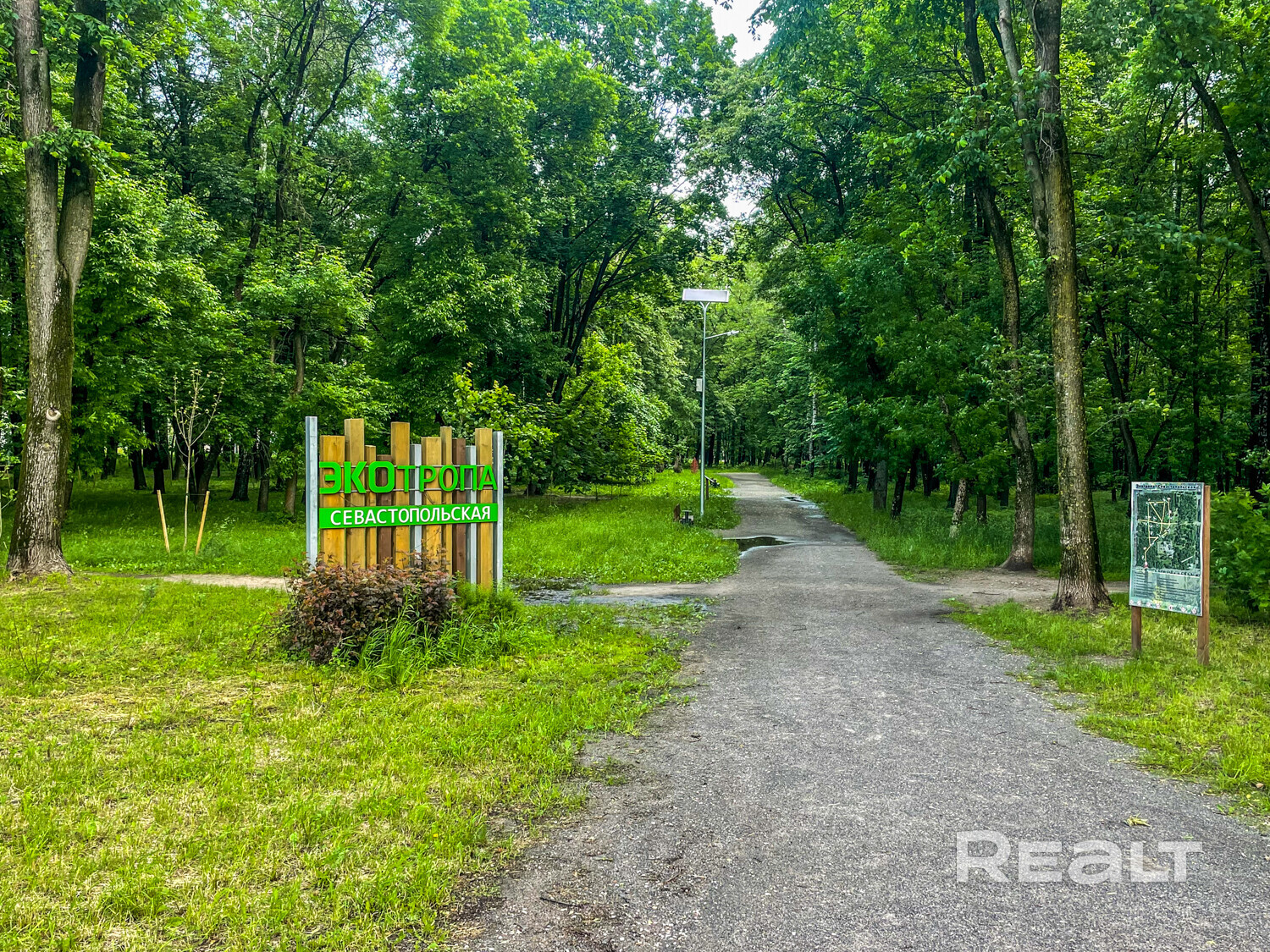 Прямо под домом ходят трамваи (остановка — в шаговой доступности), а с правой стороны к зданию примыкает обновленный Севастопольский парк — с белками и экотропами. Так как район рядом с Логойским трактом давно обжит, здесь есть вся необходимая для жизни инфраструктура — детские сады, школы, множество магазинов.