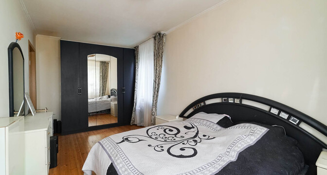 В квартире две изолированные комнаты, которые выходят на разные стороны. Выглядят они аккуратными. В окнах – стеклопакеты, на полу – паркет.