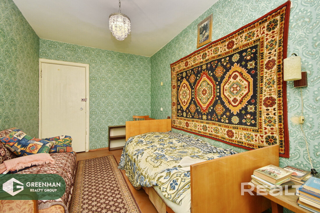 Обе комнаты — изолированные. В одной из них есть выход на балкон. Двушка нуждается в обновлении. Полы тут деревянные.