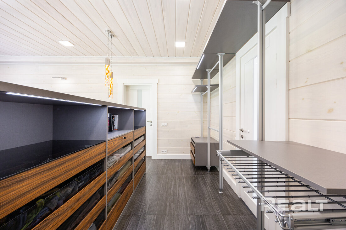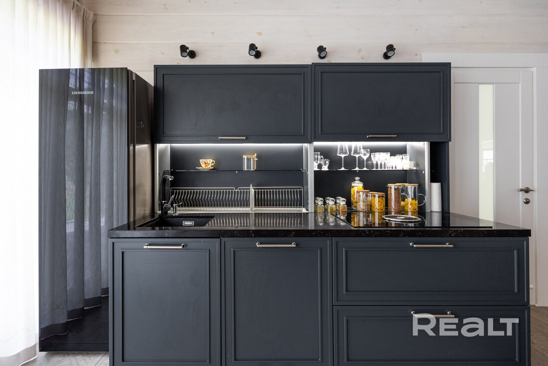 Дом укомплектован мебелью и техникой. От бренда Bora BHA тут есть варочная панель с интегрированной вытяжкой, от AEG — духовой шкаф с режимом пара, посудомоечная машина, стирально-сушильная машина, а вот холодильный блок, морозильник, винный шкаф — от Liebherr.