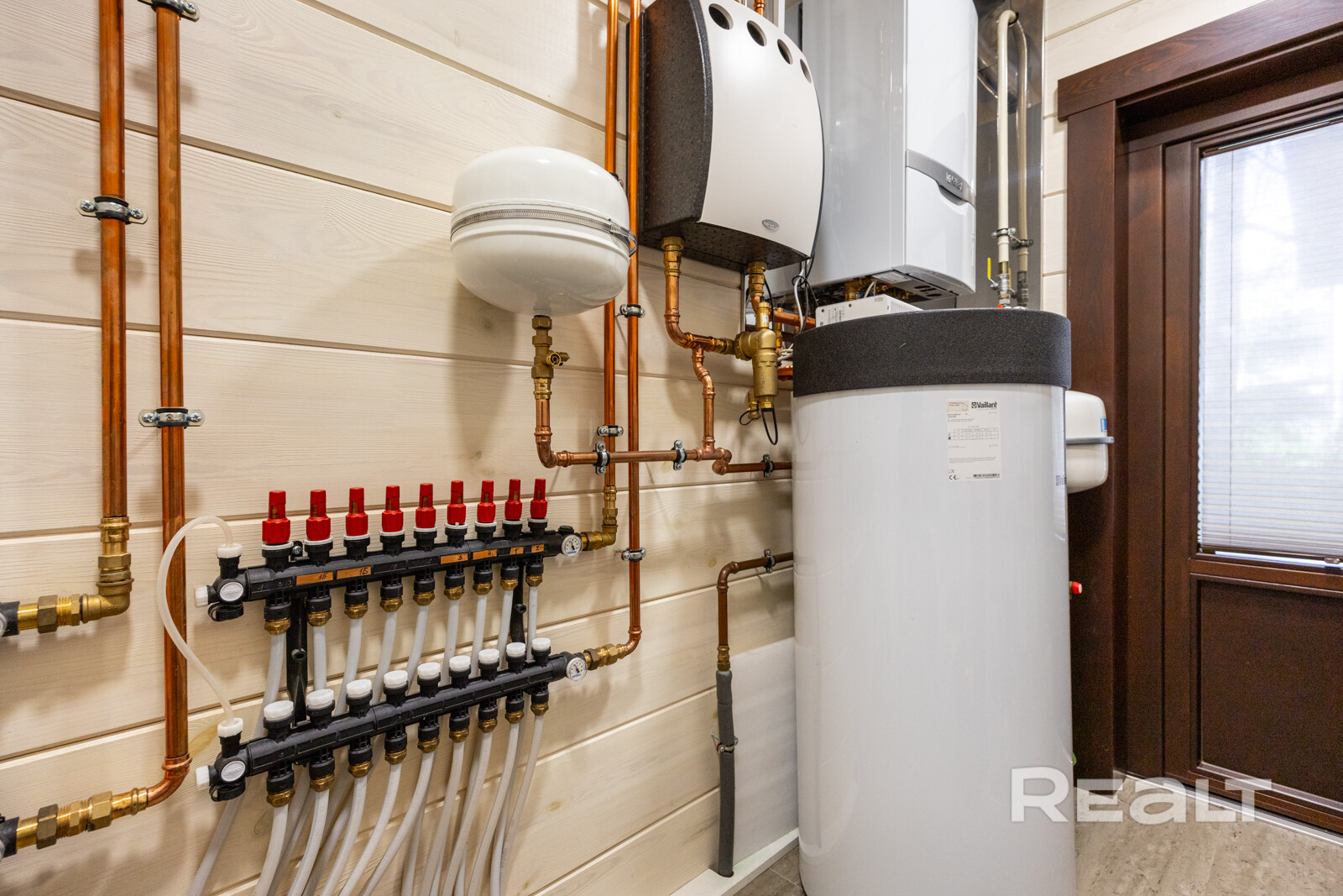 Отапливаются помещения с помощью газового котла. В топочной установлен и бойлер Vaillant. Помогают теплые полы, что лежат по всему дому.