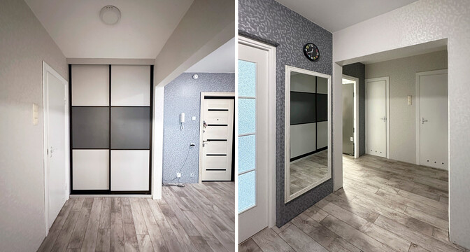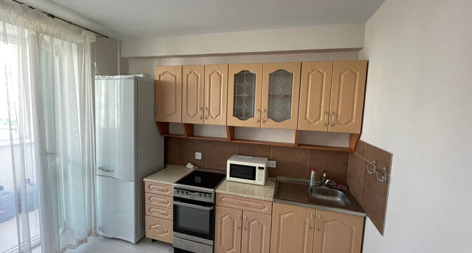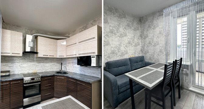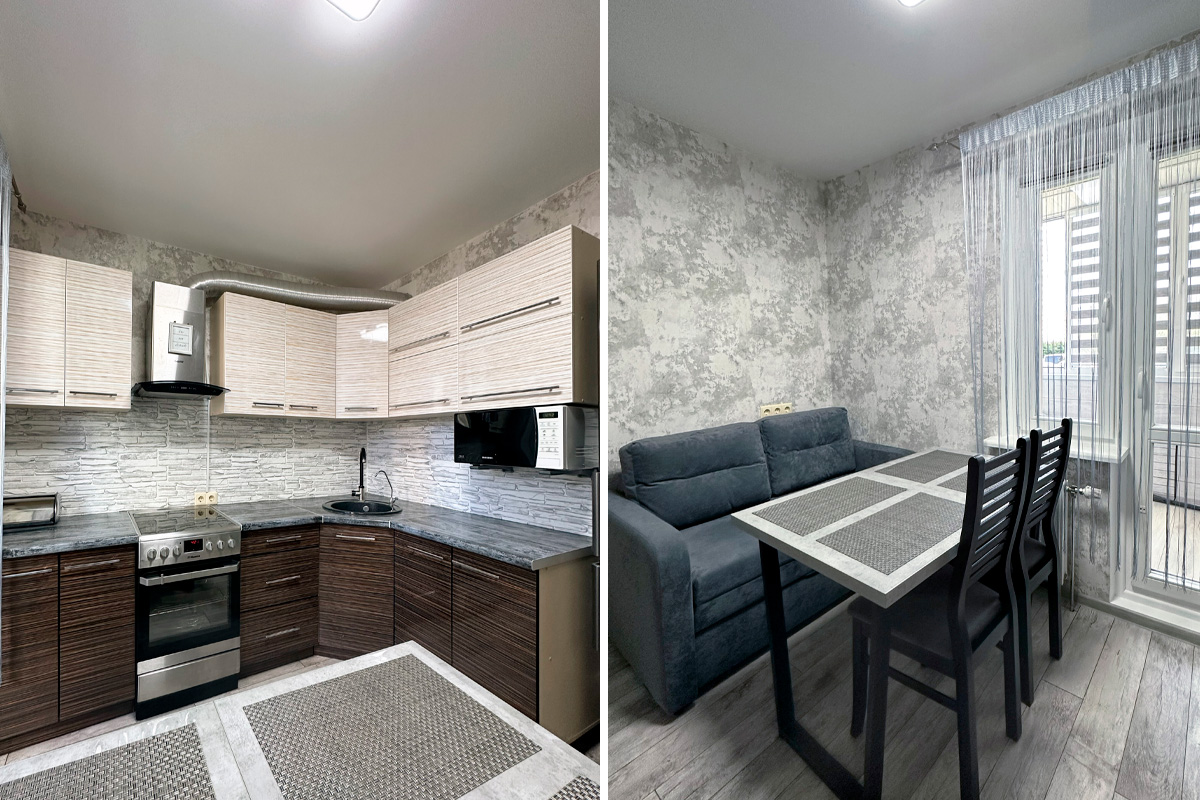 Квартира расположена на первом этаже, всего в доме их 18. Общая площадь — 45 метров, 18 из них приходится на жилую площадь, еще 9 — на кухню. В квартире сделали косметический ремонт: на полу постелили ламинат и уложили плитку. Установили кухню и два шкафа-купе в прихожей. Утеплили лоджию (выход из кухни).
