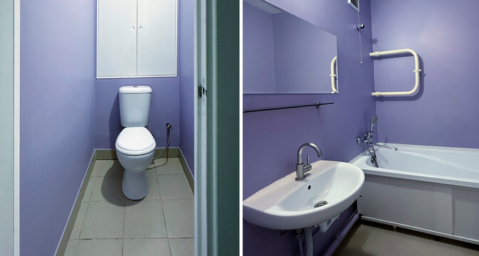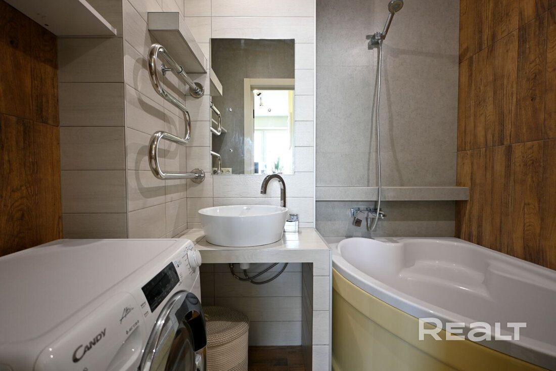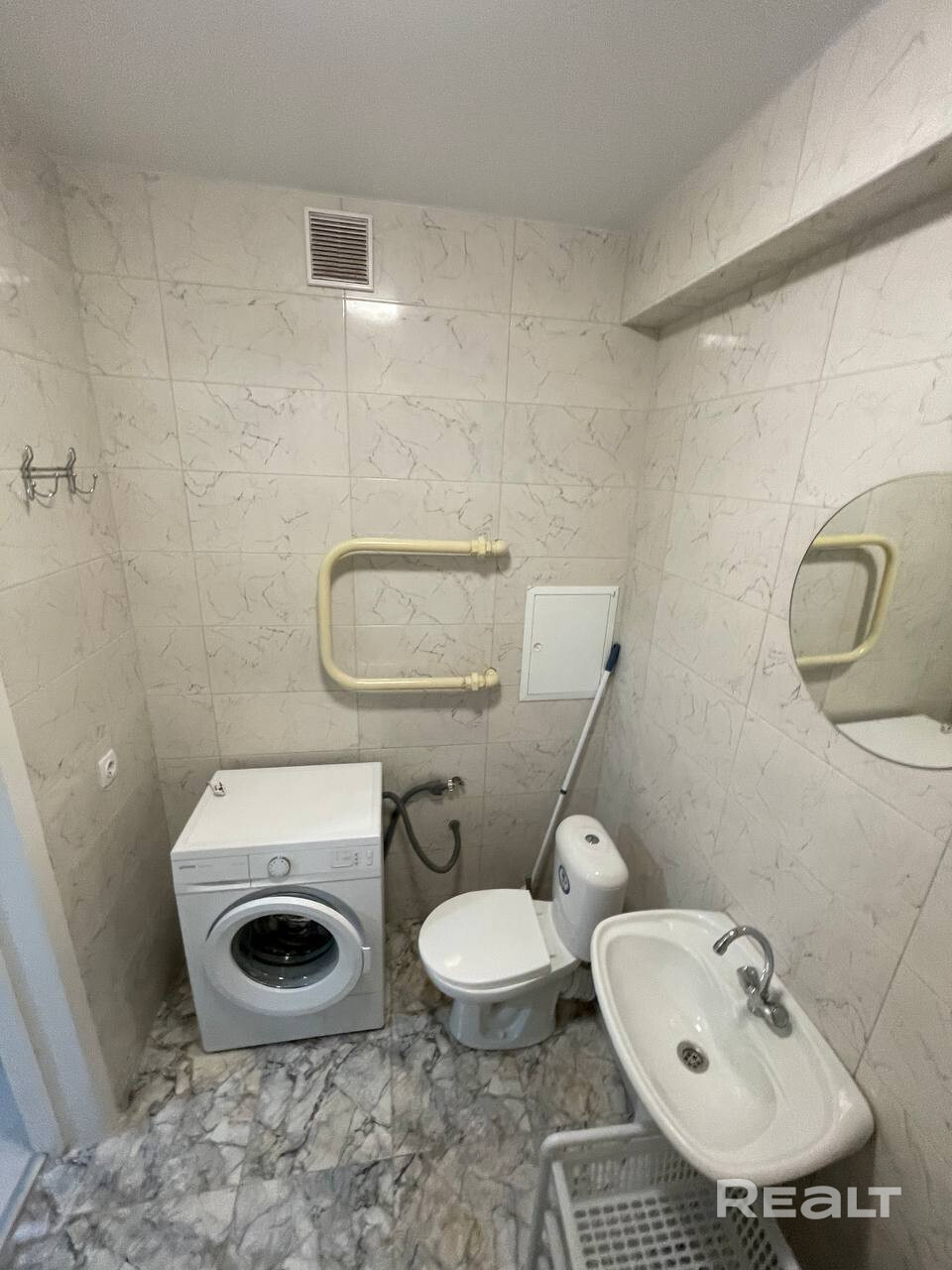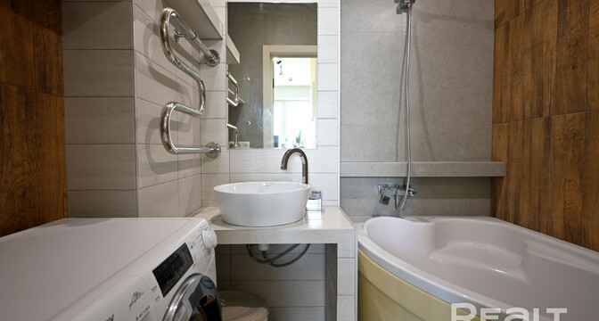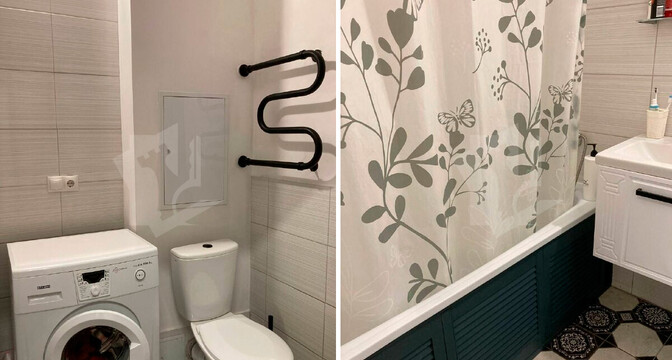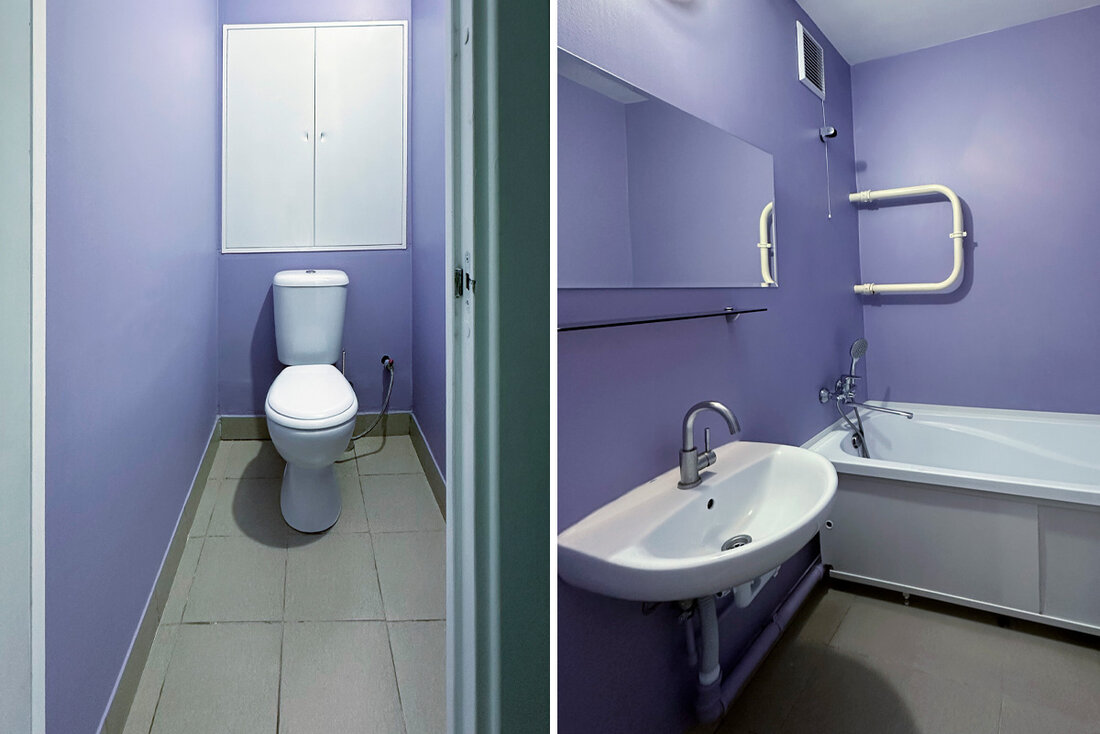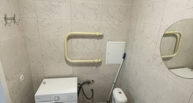 Квартира с обычным ремонтом, светлая и с минимумом мебели. Есть большая застекленная лоджия — с выходом из жилой комнаты и кухни. Санузел совмещенный. Установлена стиральная машина и ванна.