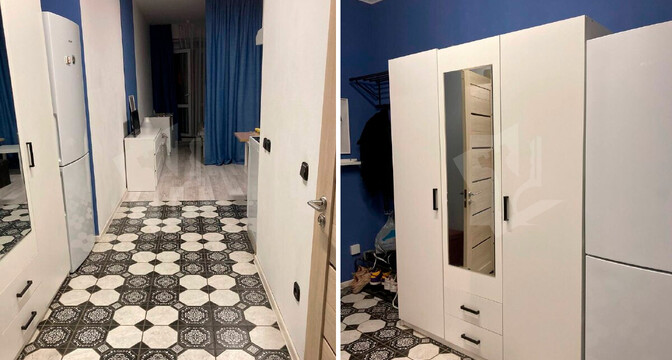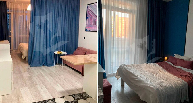 Потолки в квартире — 2,7 метра. Общая площадь — 32 квадрата, жилая — 22. В кухонной зоне установлен гарнитур с техникой. В жилой — есть двуспальная кровать (спрятанная за шторой) и диван. В прихожей установлен шкаф. В совмещенном санузле установлена ванна и подключена стиральная машина.