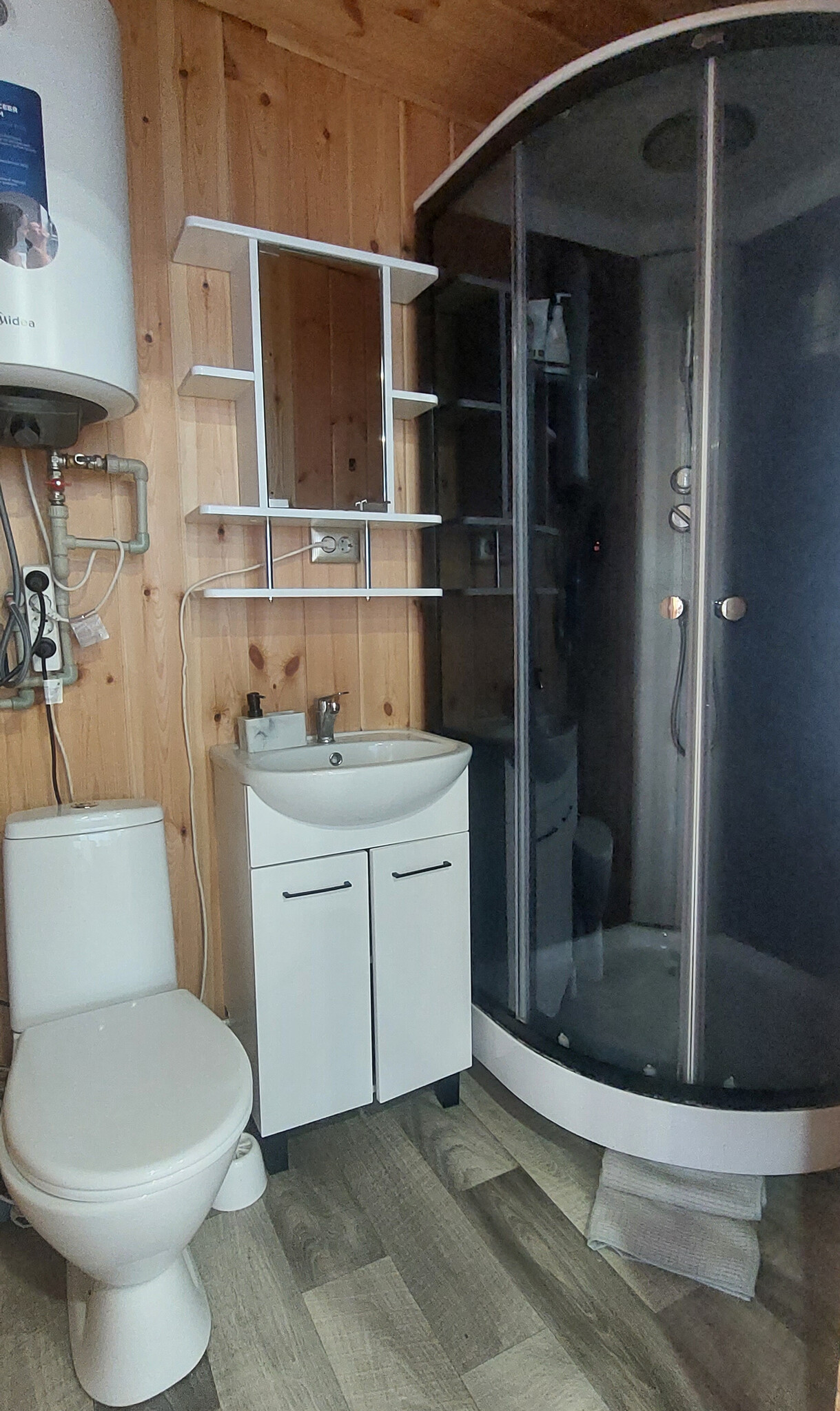 Так как в дом проведены все удобства, он подойдет и для круглогодичного отдыха. Из коммуникаций — свет, вода, кондиционер Electrolux в зимней комплектации (до -25°С). Санузел оборудован душевой кабиной и бойлером. Вода — скважина, канализация — местная.
