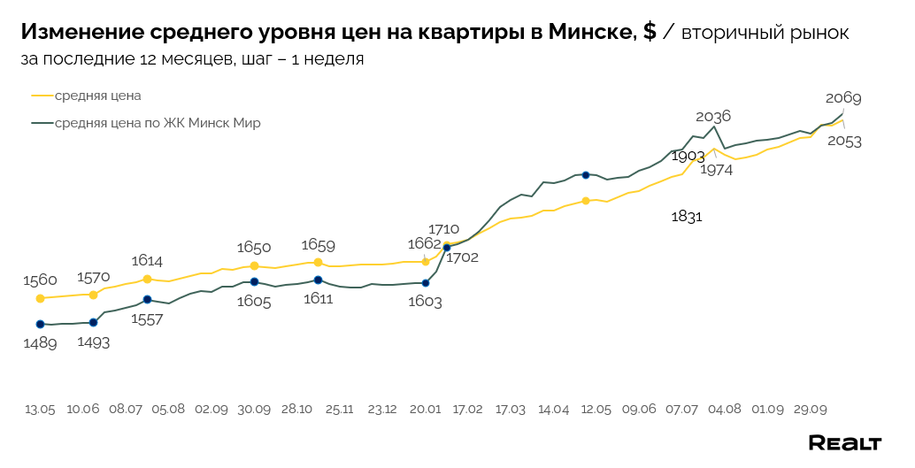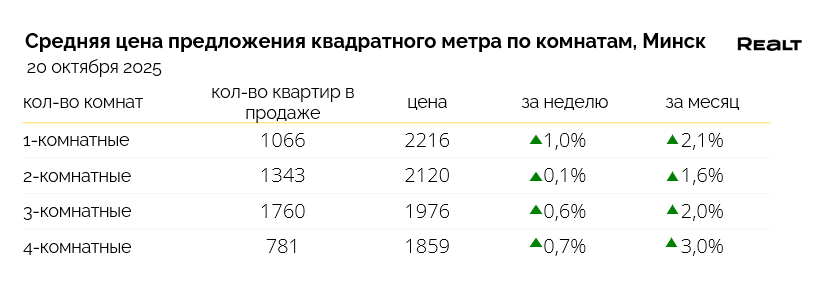 Брест — 1129 $/м2 (-0.2%), Витебск — 890 $/м2 (+0.5%), Гомель — 958 $/м2 (+0.2%), Гродно — 1051 $/м2 (+0.7%), Могилев — 997 $/м2 (-0.3%).