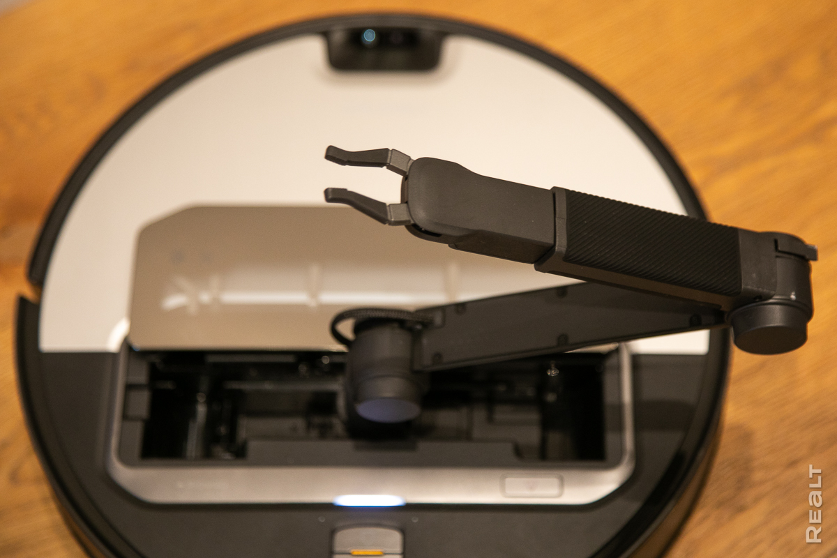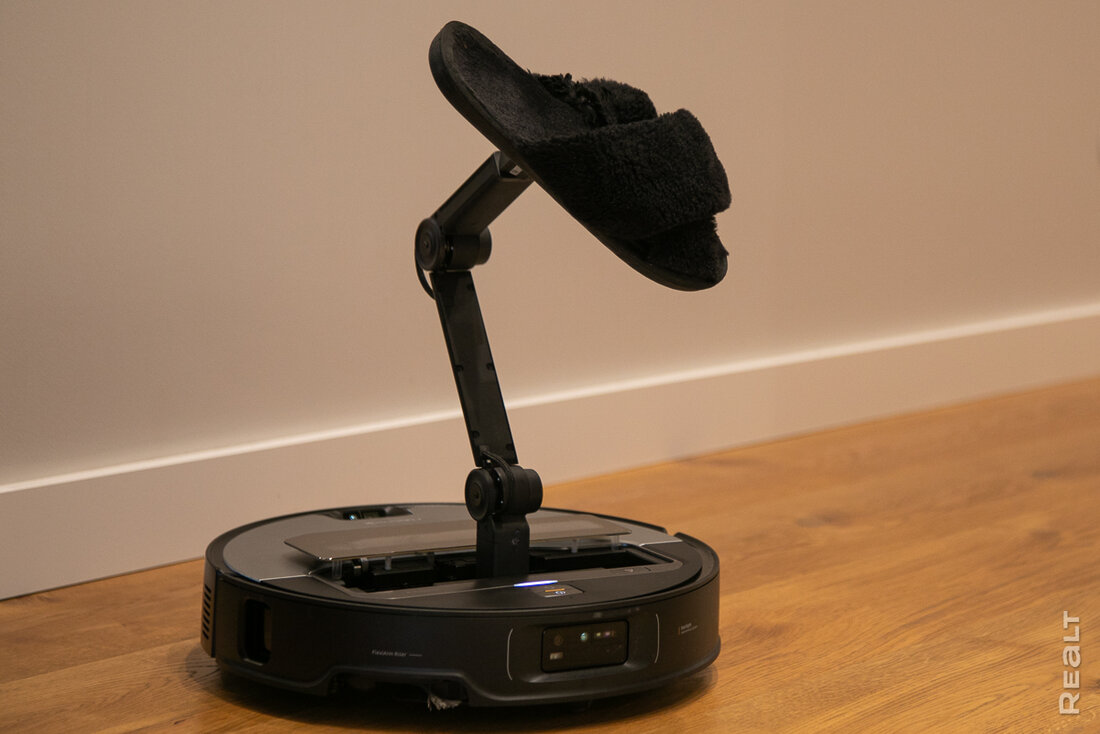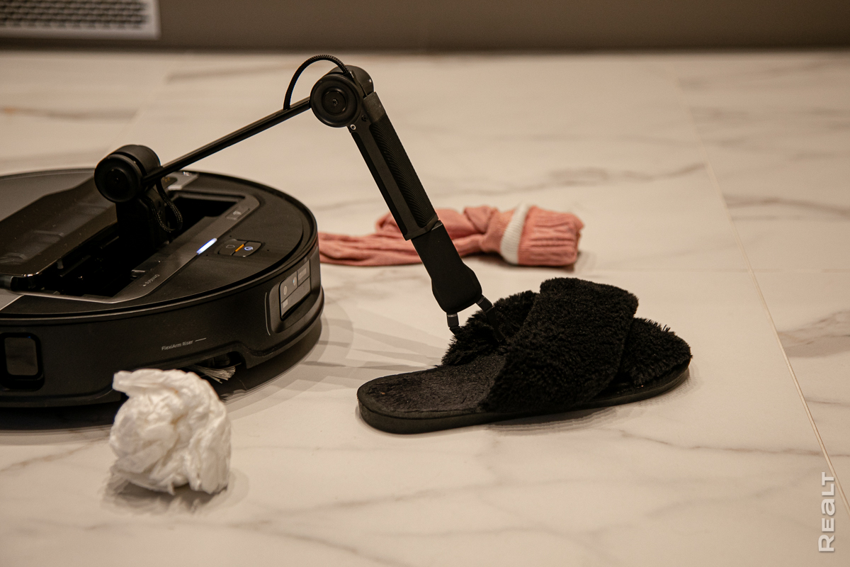 У Roborock Saros Z70 есть своя рука. Вернее, роборука OmniGrip — компактный, но поразительно ловкий механический манипулятор, который аккуратно поднимает предметы весом до 300 грамм. Кроссовок не поднимет, но определит и честно сообщит: «обнаружен крупный объект». А вот с носками, тапочками, мягкими игрушками или салфетками справляется без вопросов — мы проверили.