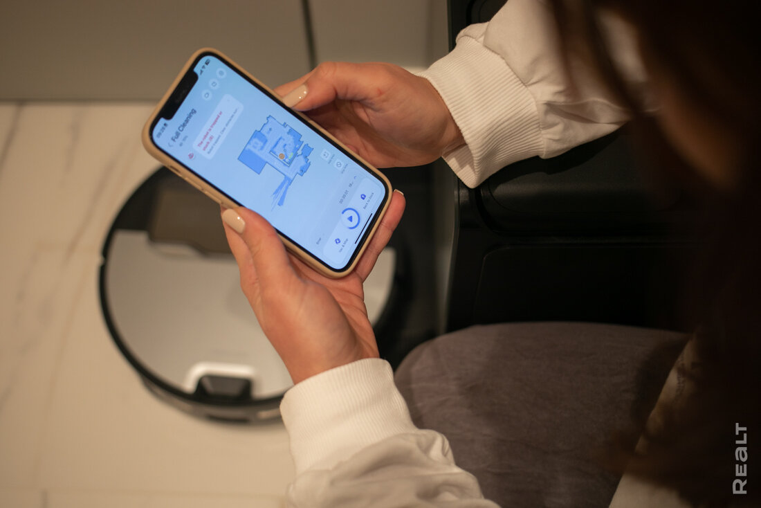 Синхронизация с приложением заняла еще меньше. Сканирование QR-кода, подключение к Wi-Fi — и приложение Roborock«узнало» Saros Z70. Интерфейс простой, полностью на русском. Управлять устройством можно через фирменное приложение, которое легко установить из App Store или Google Play. Доступны режимы уборки, карта, расписание, контроль уровня воды и голосовых команд — все интуитивно понятно.