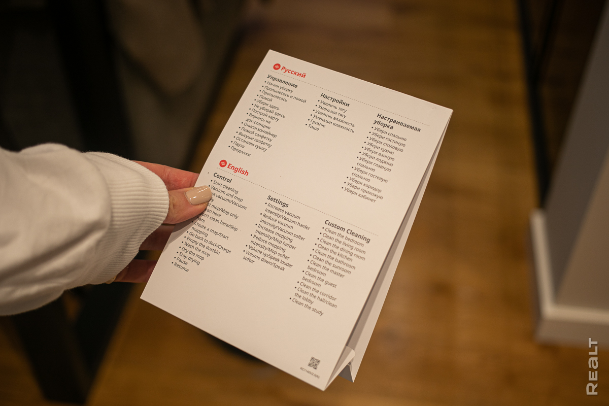 В Roborock Saros Z70 есть голосовое управление через встроенного ассистента«Hello, Rocky!» или его русскую версию — «Привет, Роки!». К комплекту прилагается список базовых команд, которые он распознает и выполняет даже в офлайн-режиме. Приятно порадовало, что во время уборки четко слышно, что говорит робот-пылесос: шум от пылесоса при уборке не перебивает голосовое общение.