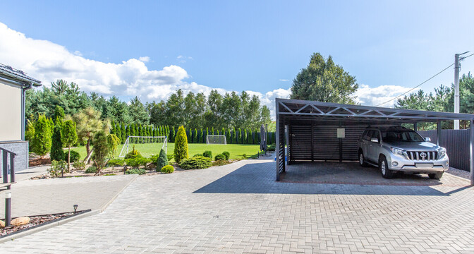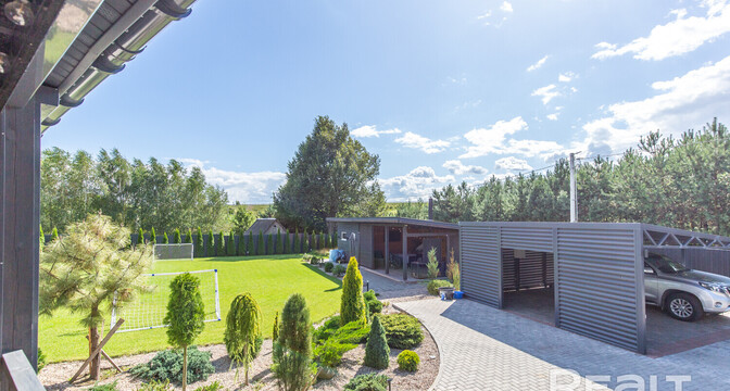 Построена летняя кухня с зоной барбекю и оборудованная проточным водонагревателем. Рядом находится хозблок, который можно переделать под баню. Тут же расположился навесной гараж на две машины с зарядкой для электромобиля.