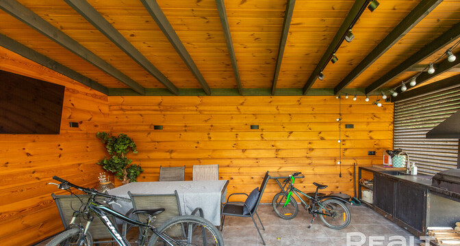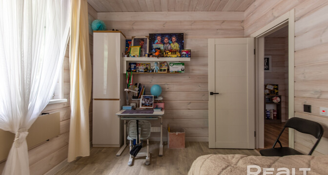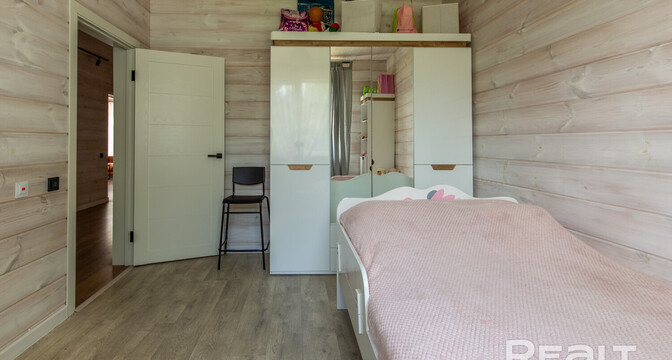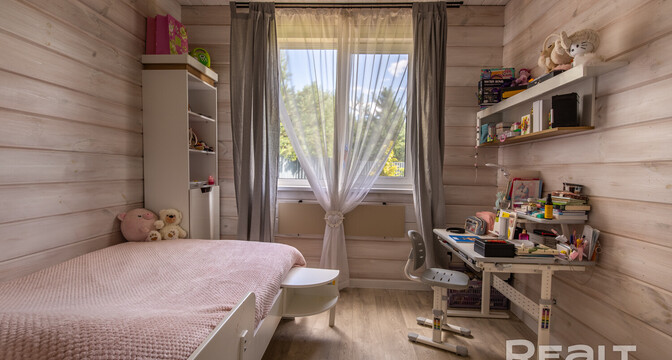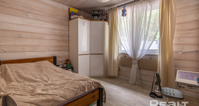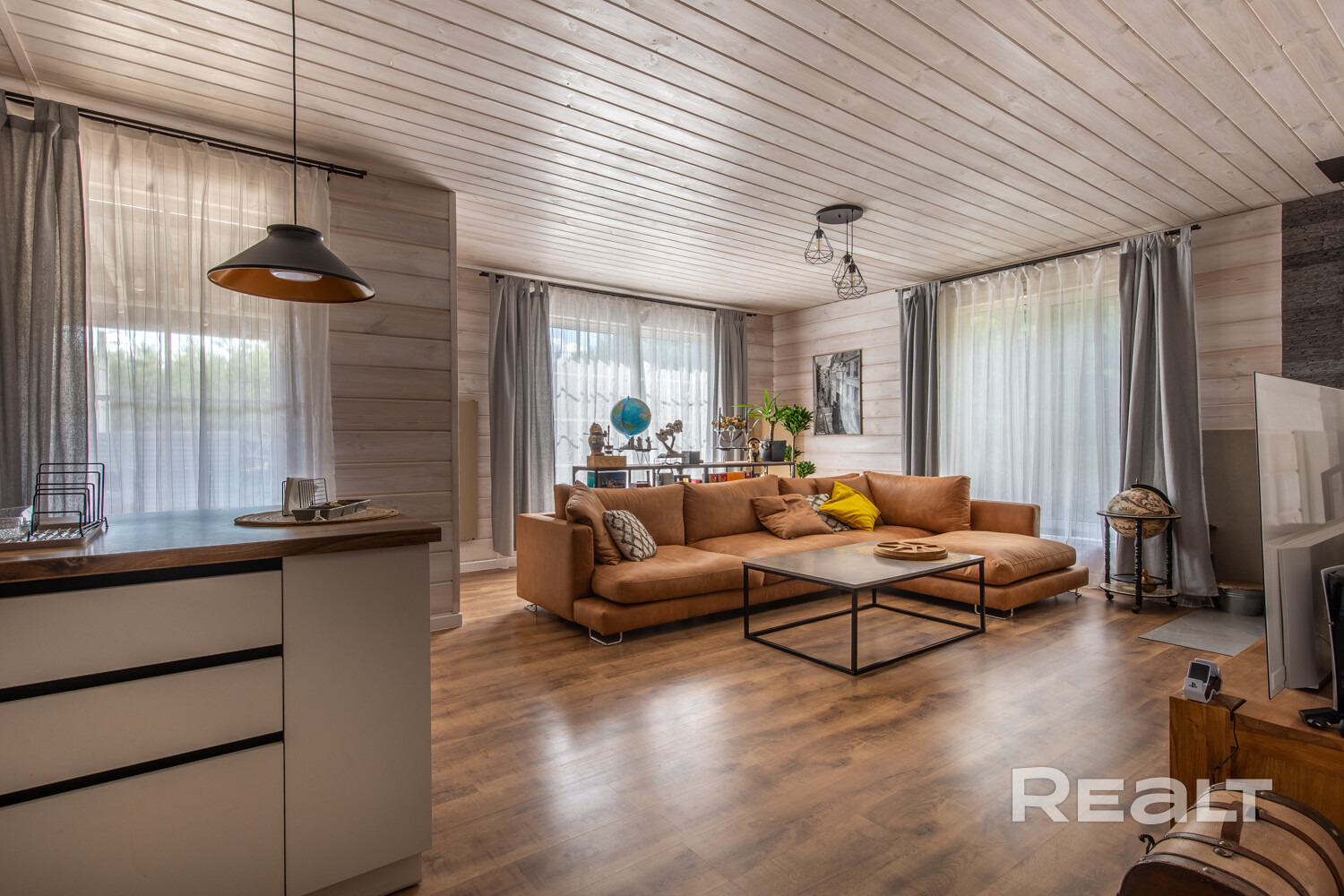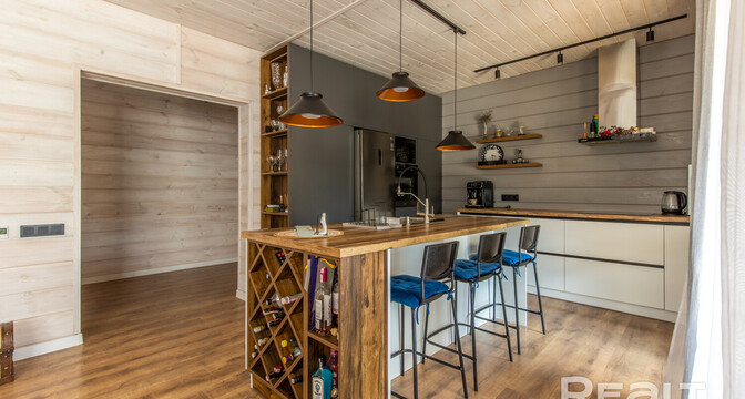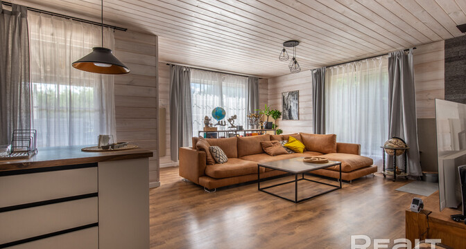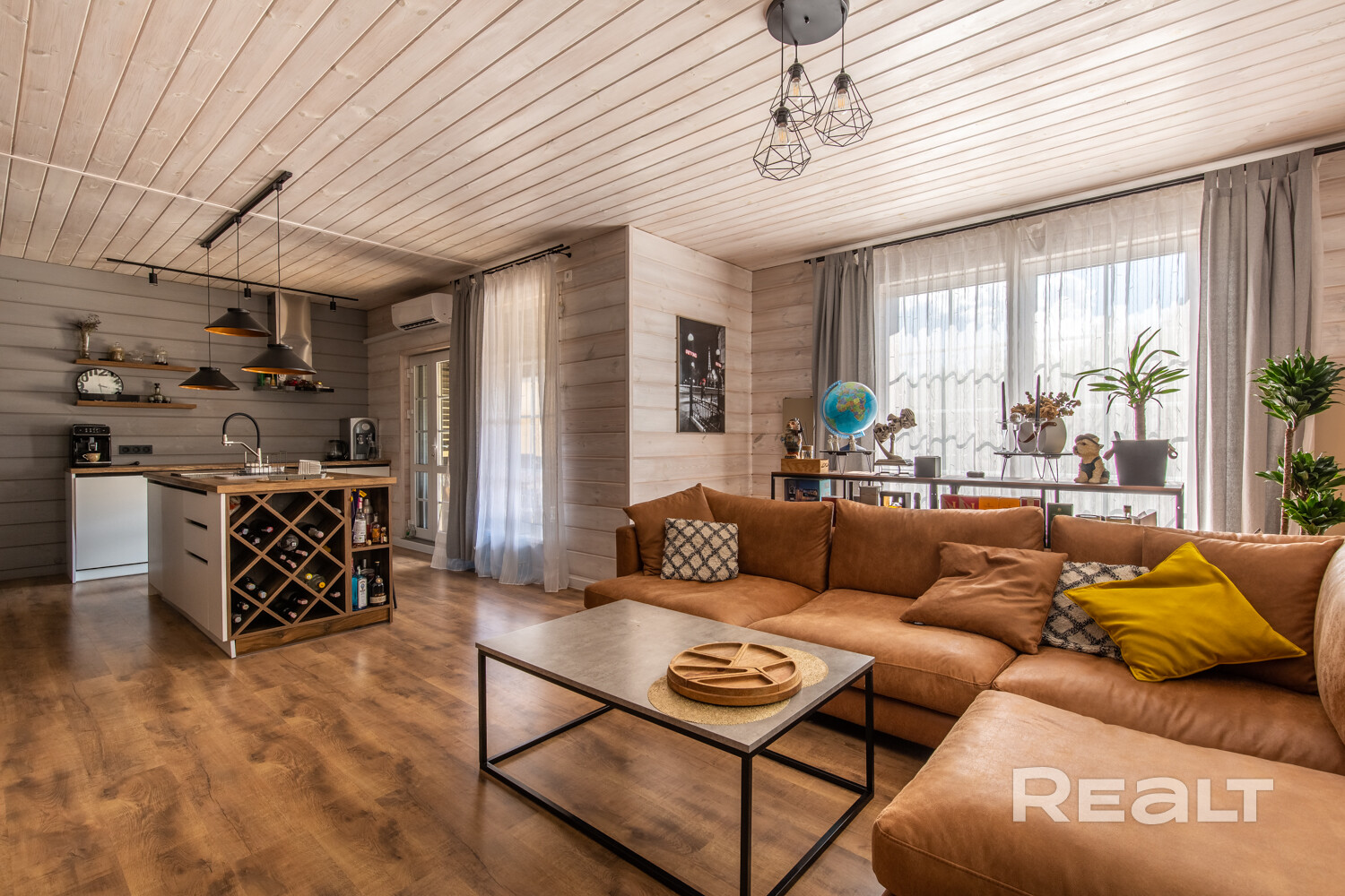 Деревня Щербины находится за Заславлем и в 23 км от Минска. Там на продажу выставлен бревенчатый дом 2022 года постройки. Его площадь — 118,5 м². Жилье возводили по скандинавской технологии. Фундамент — железобетонный, на сваях (150 см). Крышу устелили металлочерепицей. Пол, потолок и стены утеплены. Снаружи дом обшит сайдингом.