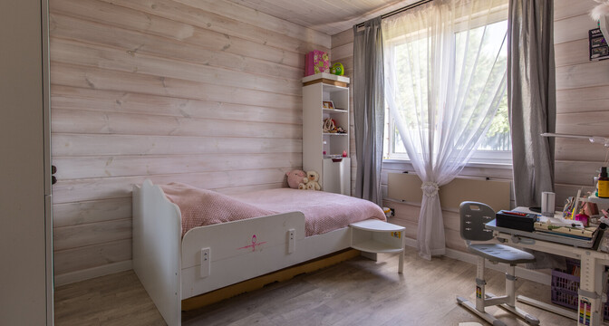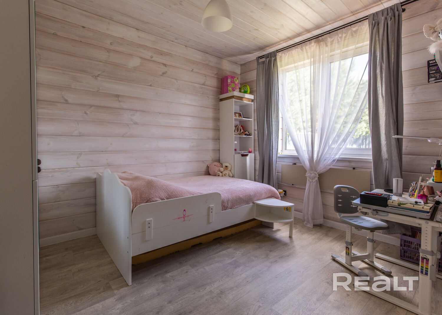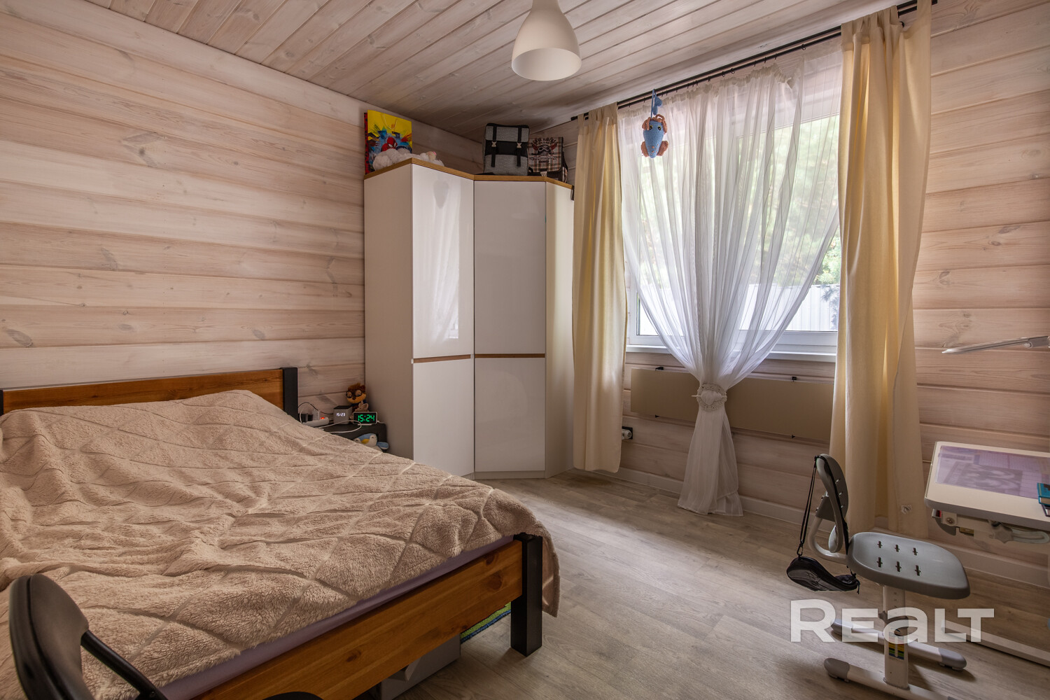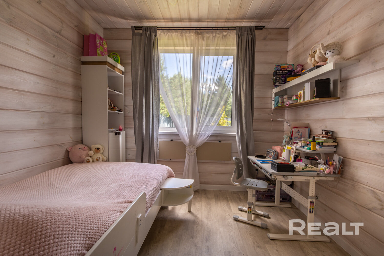 Дом с ремонтом. Стены и потолок обшиты имитацией бруса, на полу в основном лежит ламинат, в детских комнатах — линолеум. В окнах установлены двухкамерные стеклопакеты, в гостиной и хозяйской спальне — панорамные. Они идут с москитными сетками и плиссе.