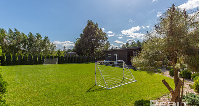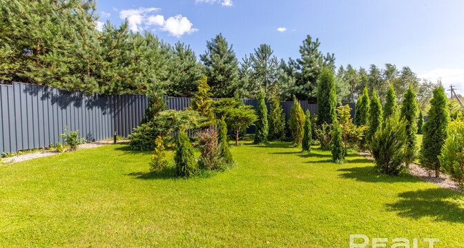 Участок занимает 13,4 сотки и окружен молодыми соснами. Территория огорожена, установлены ворота с электроприводом. По всему участку сделана дренажная система и противокротовая сетка.