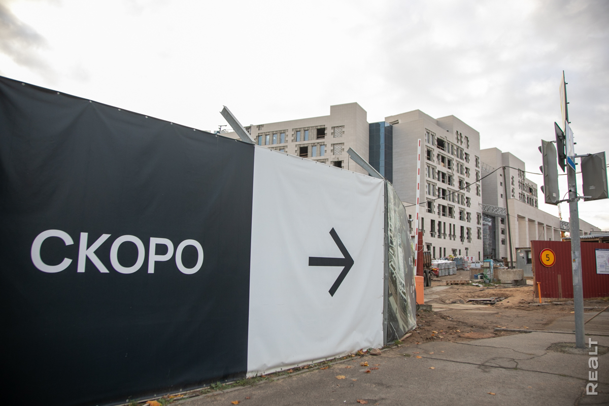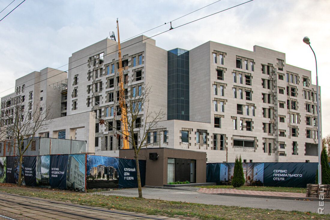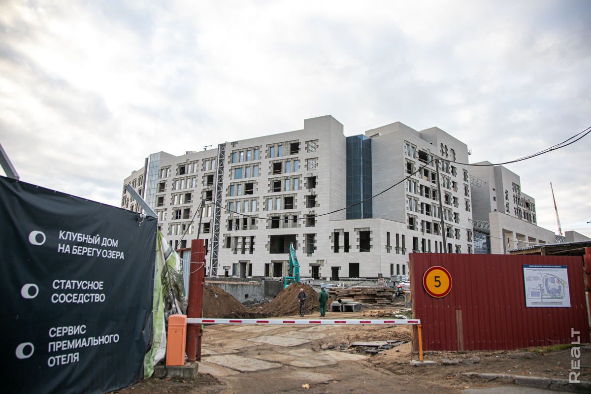 Подходим к несостоявшемуся отелю Hyatt на Старовиленском тракте и сразу обращаем внимание на новое «имя» здания. Теперь это — «Клубный дом на берегу озера». Рассматриваем рекламные баннеры и пытаемся заглянуть за строительный забор жилого комплекса.