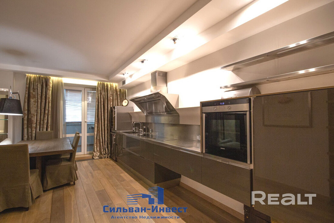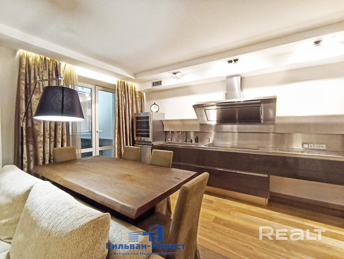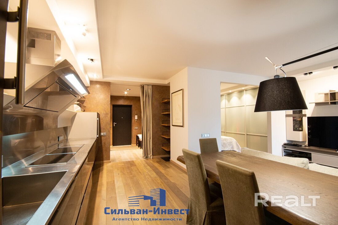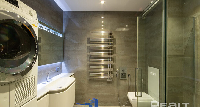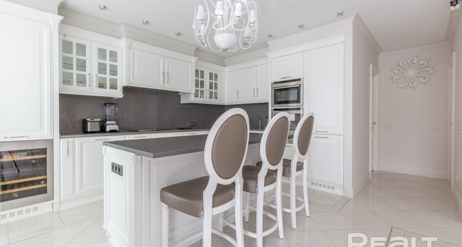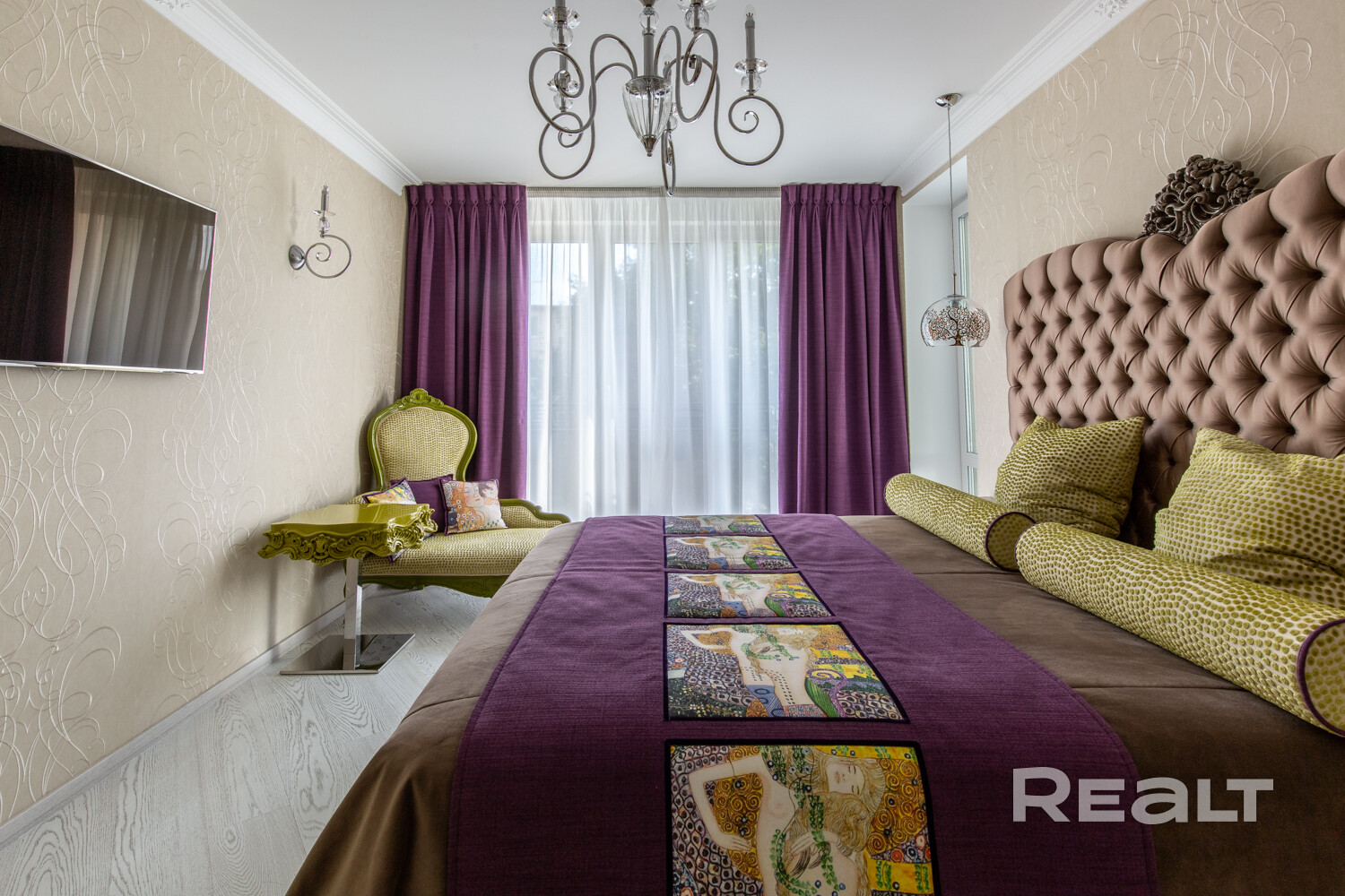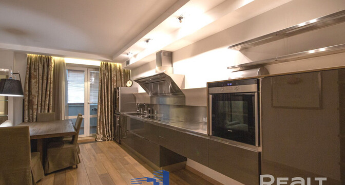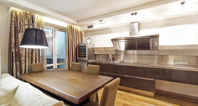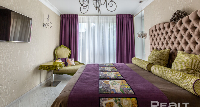 Самый недорогой вариант — квартира «с мужским характером». Общая площадь жилья составляет 55 квадратов. Квартира на первом этаже состоит из кухни-гостиной и отдельной небольшой спальни без окна. В евродвушке выполнен дизайнерский ремонт с использованием импортных материалов. Полы — дубовый паркет, плитка с подогревом. В квартире установлена премиальная бытовая техника — холодильник, морозильник, винный шкаф, варочная панель, стиральная и сушильные машины. Продают квартиру за 190 тысяч долларов (3193 доллара — за метр).