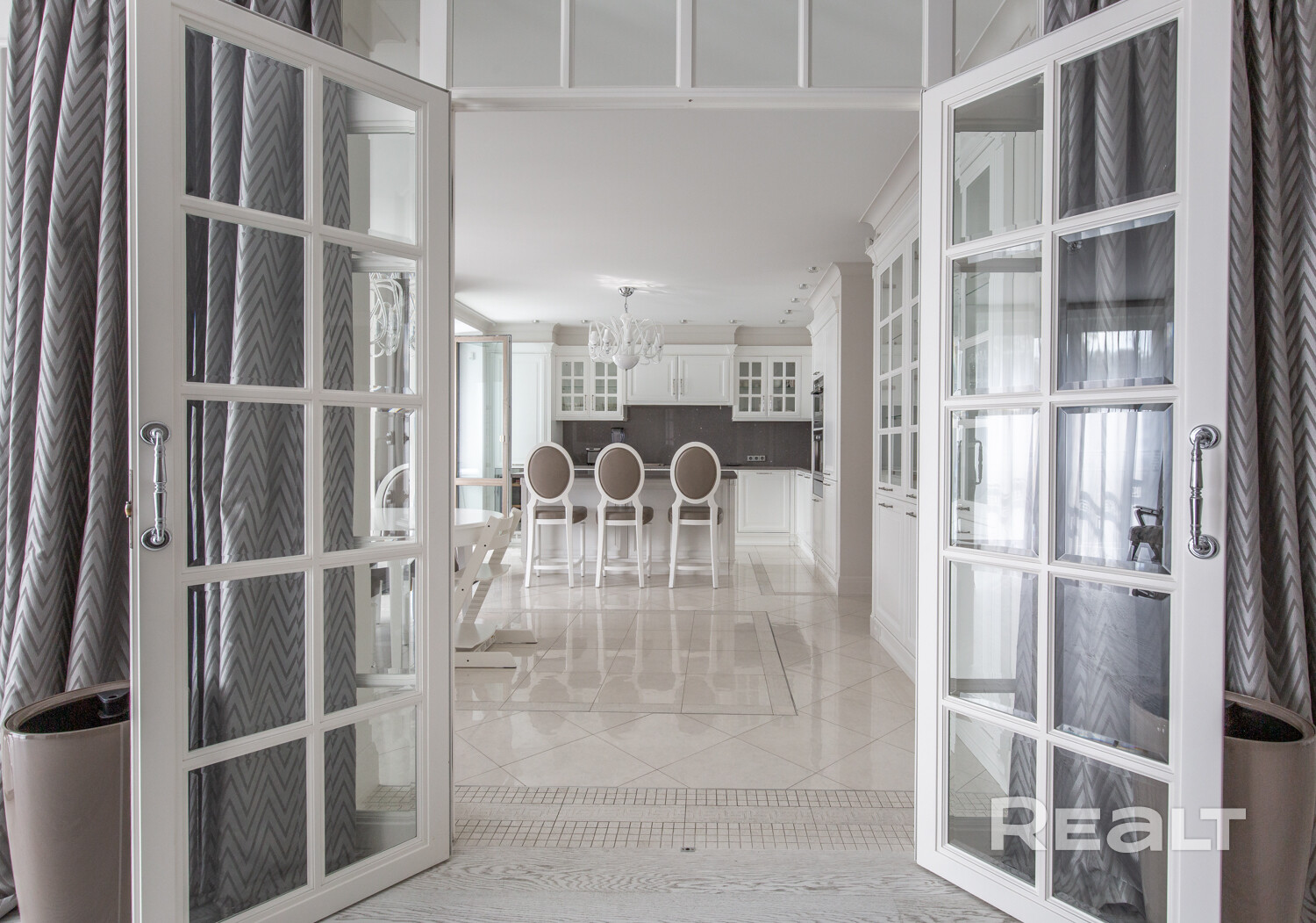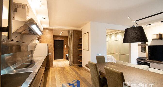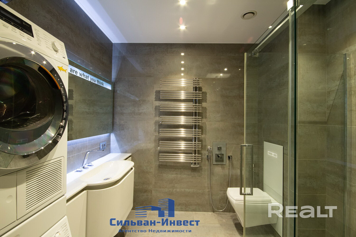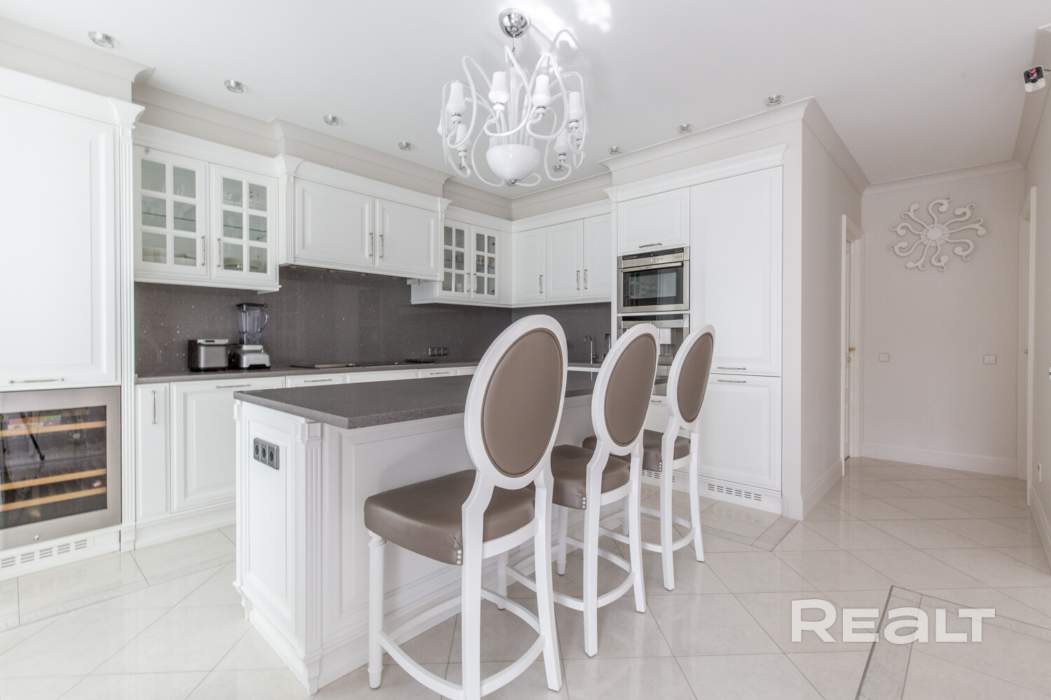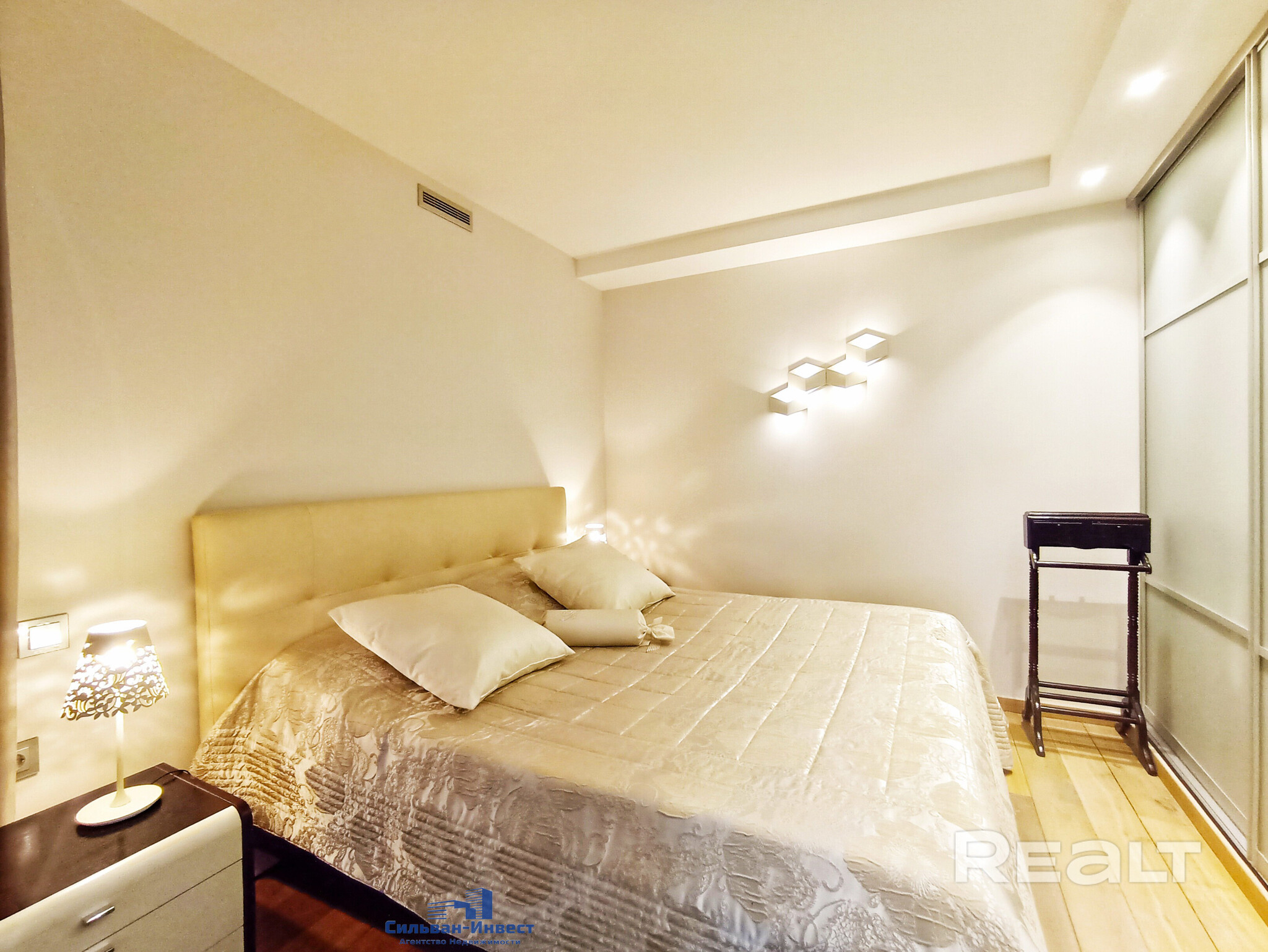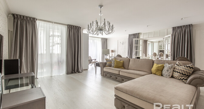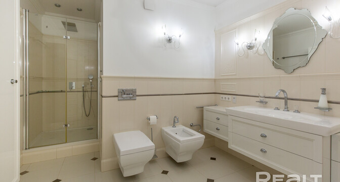 Самый недорогой вариант — квартира «с мужским характером». Общая площадь жилья составляет 55 квадратов. Квартира на первом этаже состоит из кухни-гостиной и отдельной небольшой спальни без окна. В евродвушке выполнен дизайнерский ремонт с использованием импортных материалов. Полы — дубовый паркет, плитка с подогревом. В квартире установлена премиальная бытовая техника — холодильник, морозильник, винный шкаф, варочная панель, стиральная и сушильные машины. Продают квартиру за 190 тысяч долларов (3193 доллара — за метр).