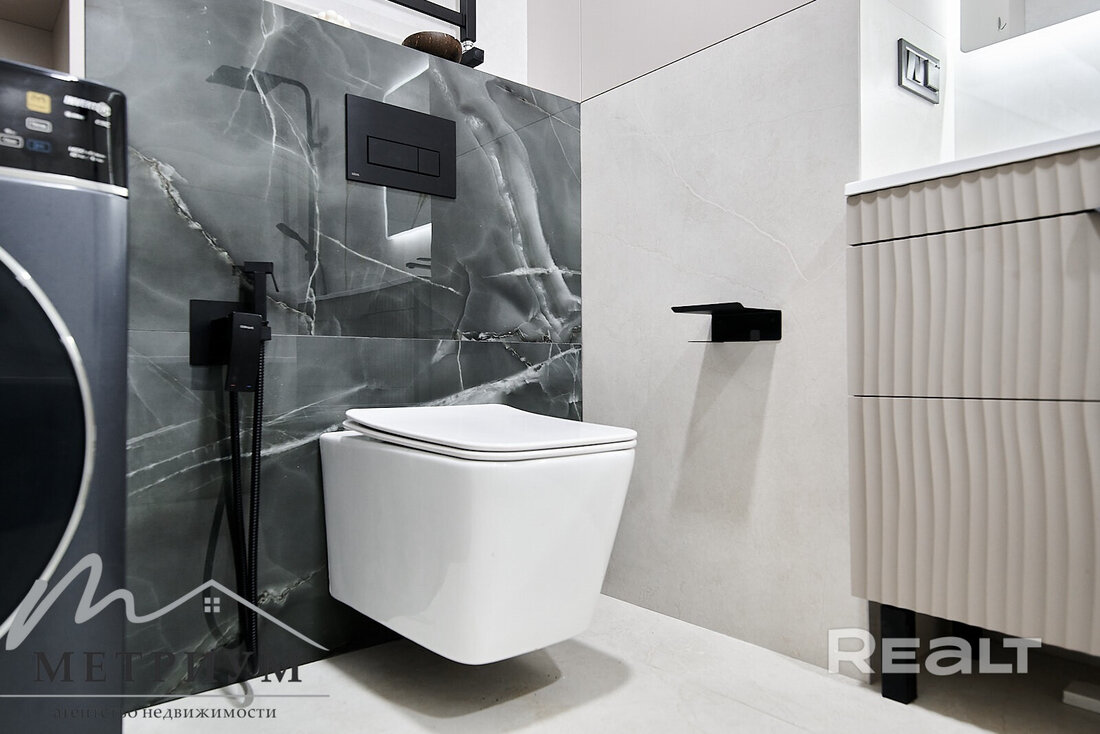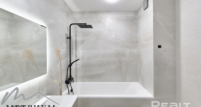 В квартире современный ремонт в светлых тонах: на полу крупноформатный испанский керамогранит, на стенах итальянская декоративная штукатурка. Получилось изолировать небольшую спальню. В совмещенном санузле установлена ванна. Есть лоджия.