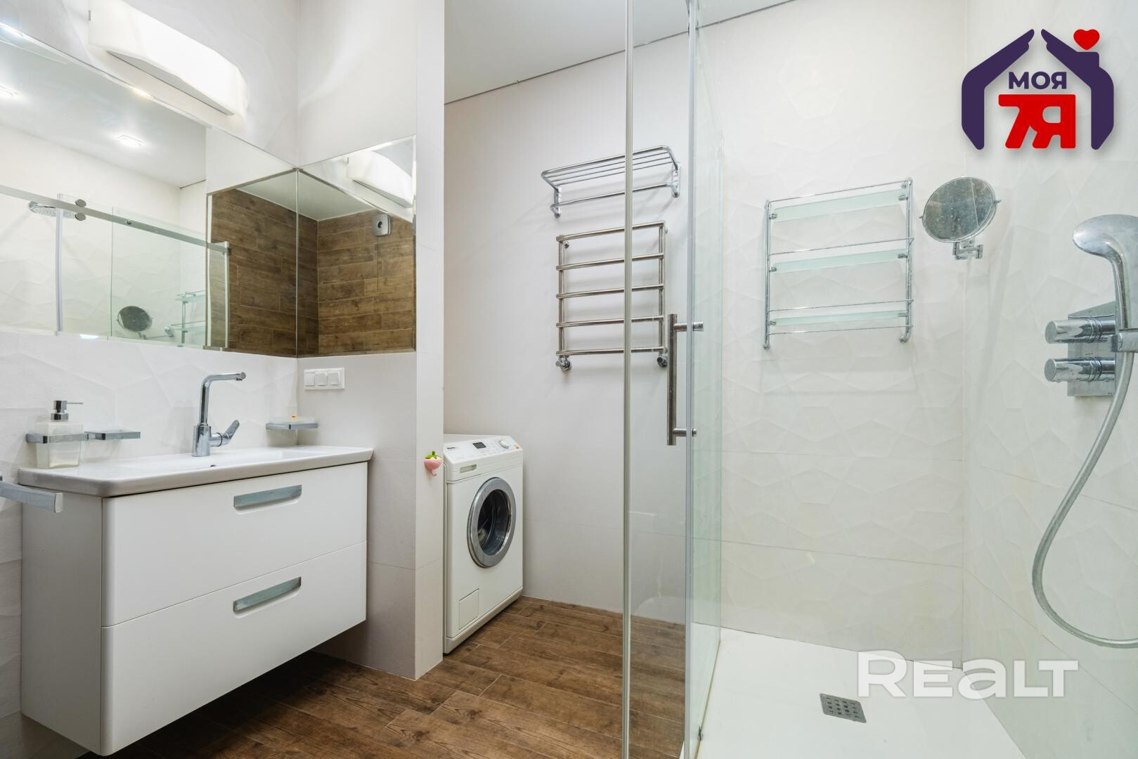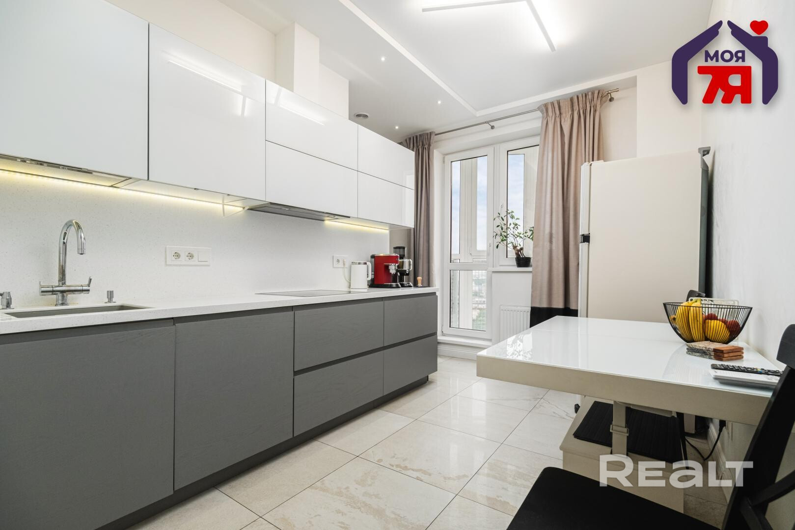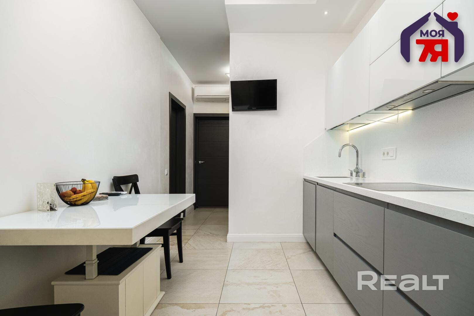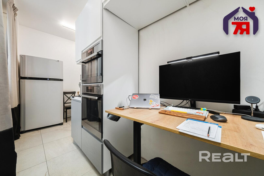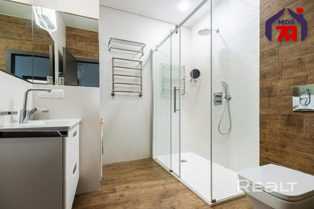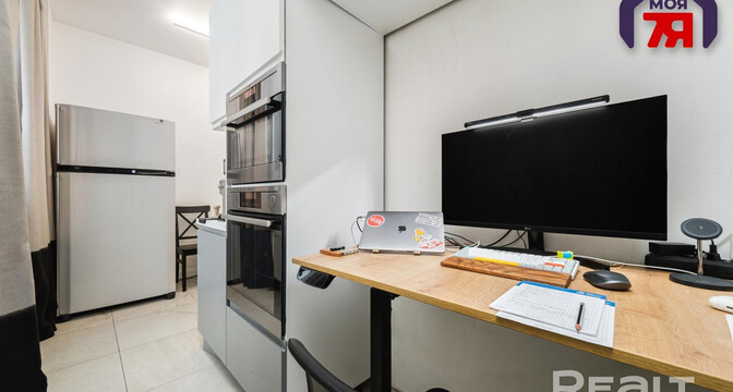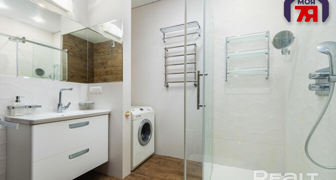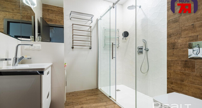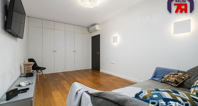 В квартире хороший ремонт — натяжные потолки с точечной подсветкой, паркетная доска на полу в комнатах, плитка — на кухне, в ванной и прихожей. Везде предусмотрен теплый пол. На кухне оборудовано рабочее место. В каждой комнате установлены кондиционеры Mitsubishi. Санузел совмещенный.