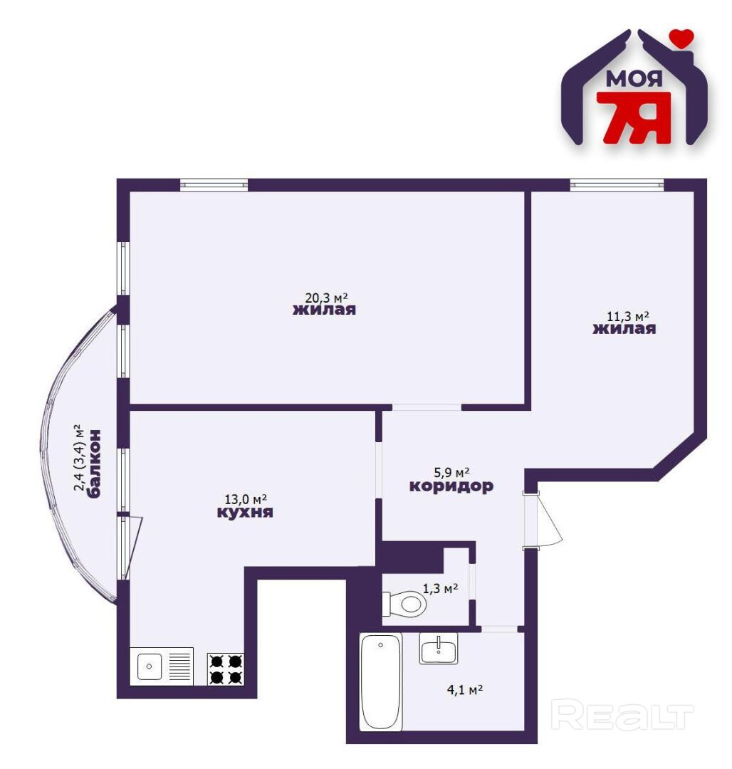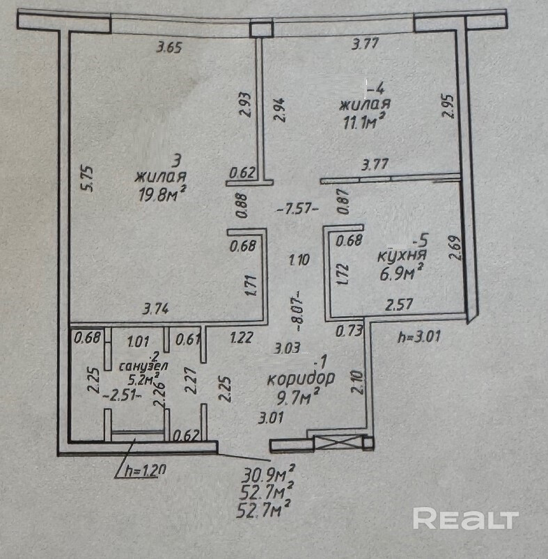 Общая площадь — 53 квадрата, жилая — 31. Метраж кухни — 7 квадратов.