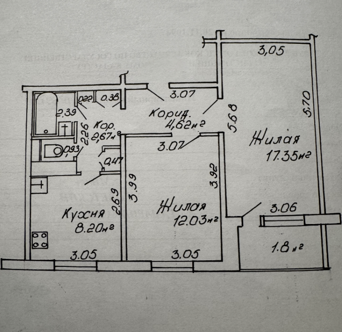 Общая площадь — 58 квадратов, жилая — 32 метра, кухня — 13 квадратов.