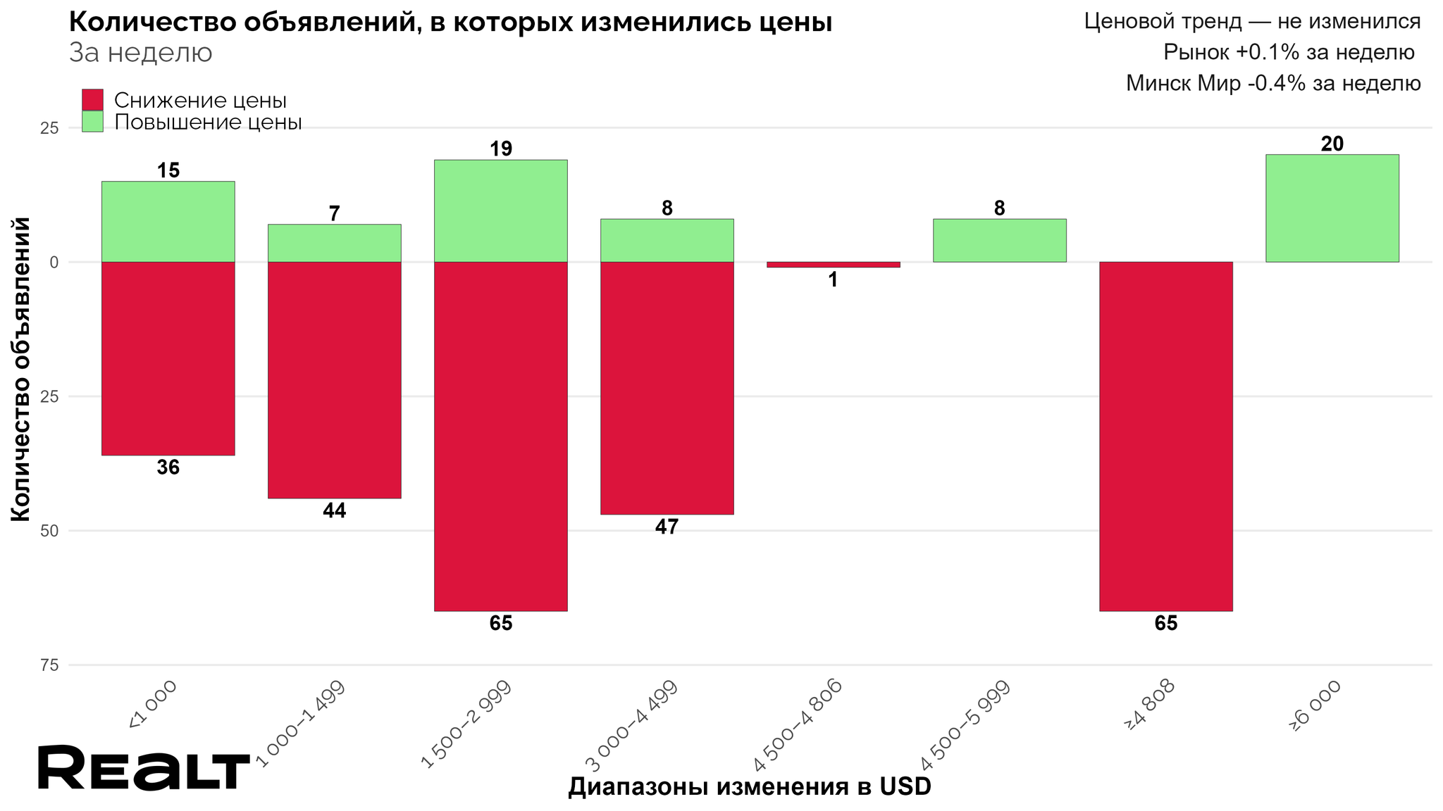 Количество продавцов, снизивших стоимость продаваемых квартир увеличилось. За прошлую неделю было около 343 квартир, которые подешевели в среднем на 1000−4000 долларов — это около 7% от всего предложения. В то же время 133 квартиры в продаже (около 3%) стали дороже в среднем на 1500−6000 долларов.