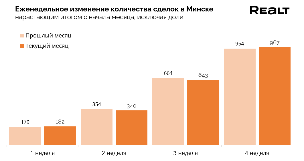 По итогам четвертой недели октября продажи квартир в Минске догнали уровень аналогичного периода сентября. Это значит, что по итогам месяца чистая цифра продаж прогнозируется на уровне 1 380 проданных квартир. В этом нет ничего выдающегося, потому что сентябрь был весьма посредственным месяцем по части продаж в этом году. Просто стабильно средний спрос, не более того.