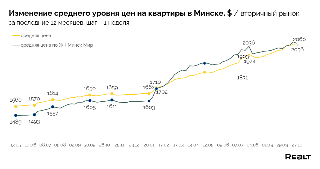 В результате, за последнюю неделю мы видим возвращение роста средней стоимости кв. м. — в рамках недели на 0.1% до 2056 $/м2. Цена кв. м. на квартиры в Минск-Мире при этом уменьшилась на 0.4% и достигла 2060 $/м2.