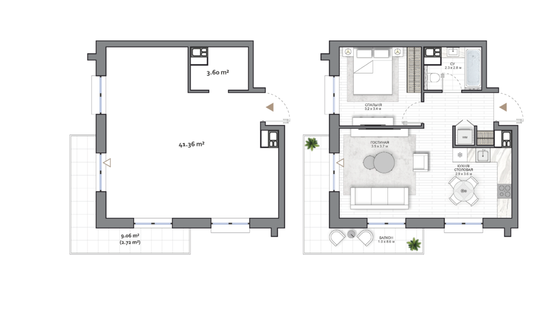 Второй вариант будет попросторнее — общая площадь составляет 39,16-40,31 м². В отличие от первой планировки, здесь уже есть выделенная спальня. А значит, что в квартире комфортно жить будет не только одному человеку, здесь сможет разместиться и пара. В остальном, планировка близка к предыдущей: кухня, совмещенная с гостиной, раздельный санузел, балкон.