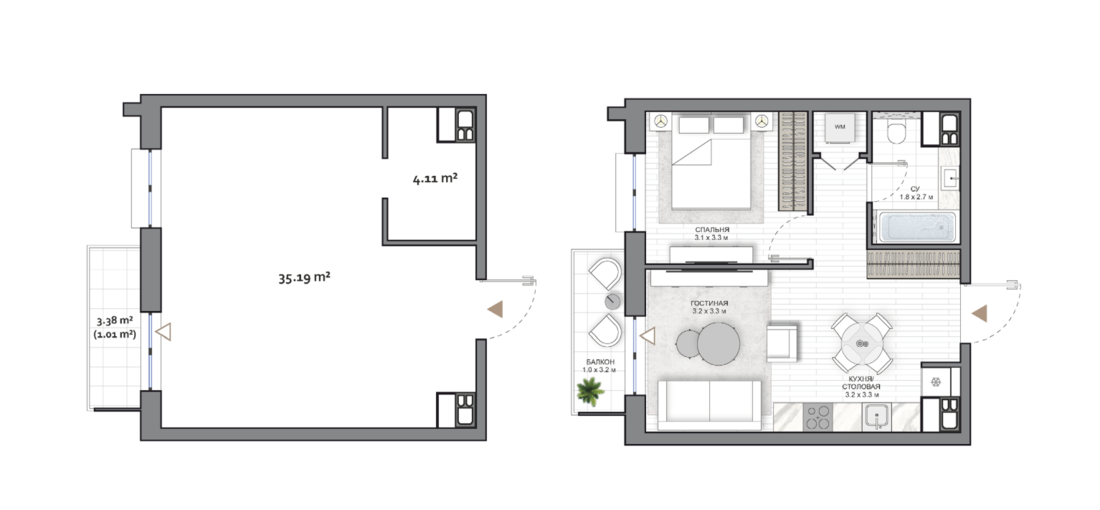 Первая и самая компактная из всех планировок — это студия общей площадью 32,53-33,41 м². Это вариант с кухней и гостиной, объединенными в общее пространство. Даже на небольшой площади есть гардеробная. Санузел в квартире совмещенный. Вот как выглядит эта планировка.