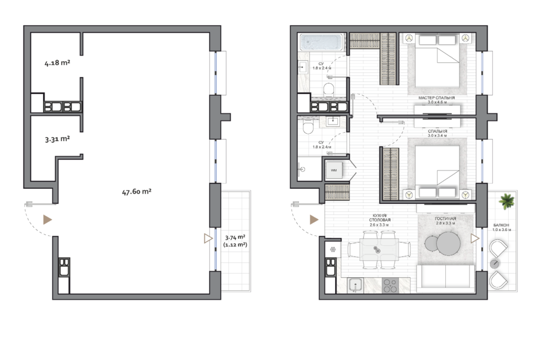 Квартира с объединенными гостиной и кухней и двумя спальнями. Одна из комнат — это мастер-спальня со своим санузлом и гардеробной. В другой же можно сделать гостевую спальню, детскую или кабинет. Общая площадь — 54,47-56,21 м².