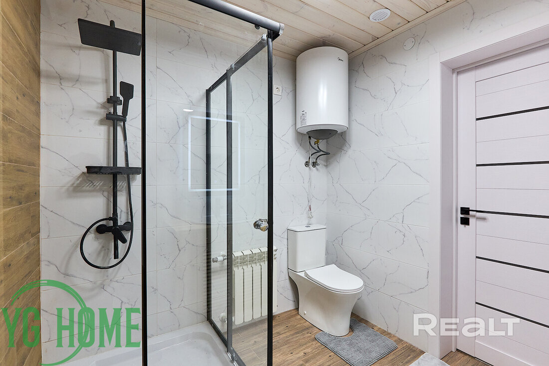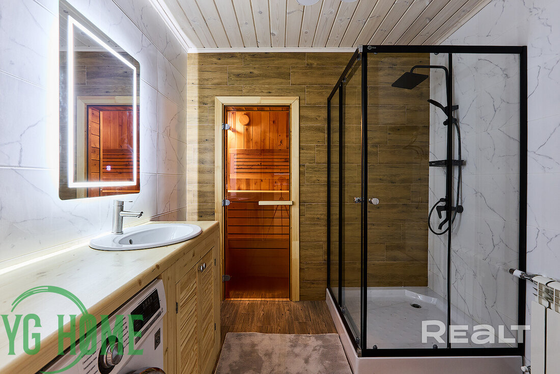 В доме сделан просторный совмещенный санузел с душевой кабиной и выходом в сауну.