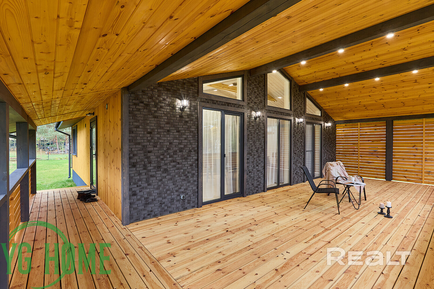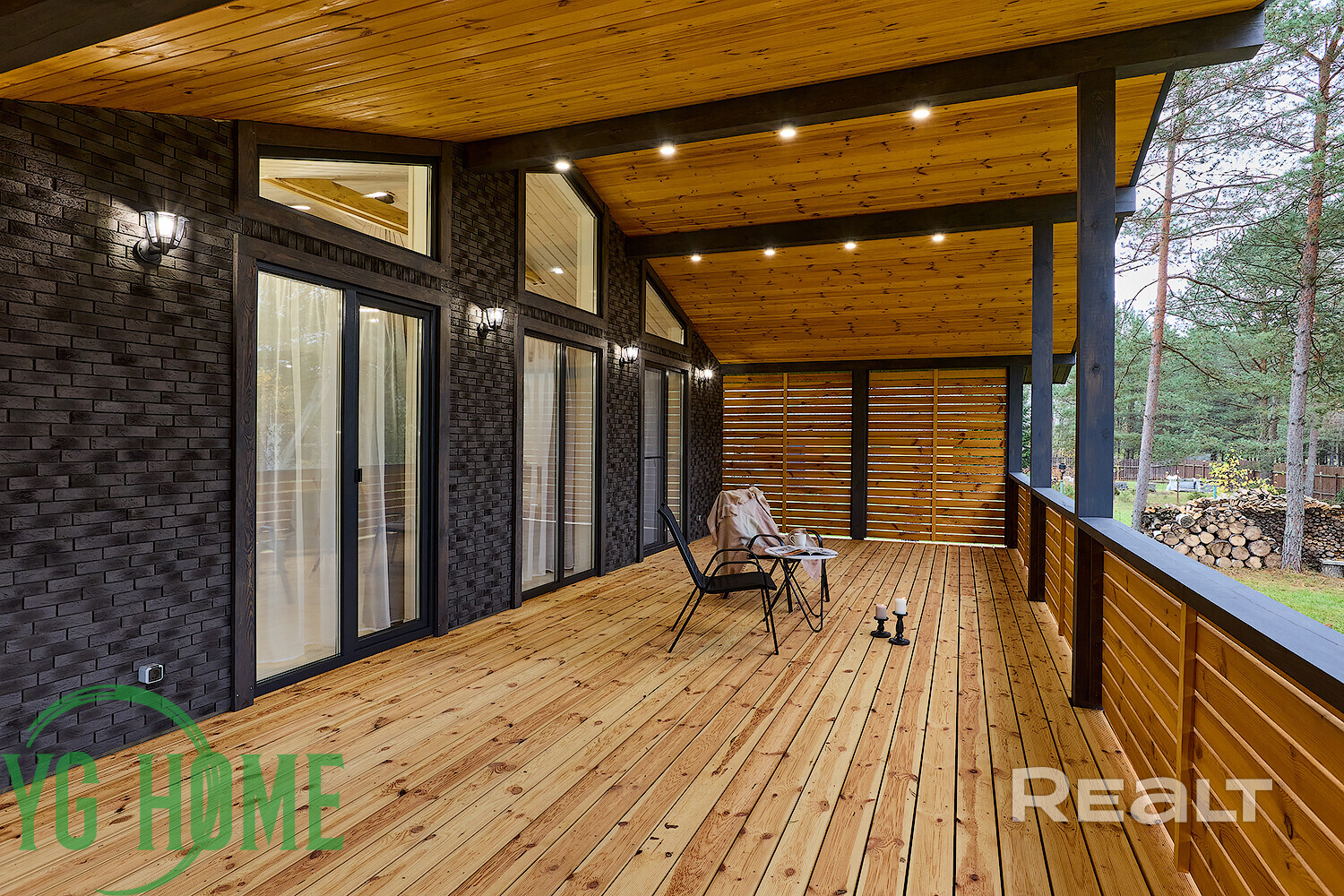 Терраса в доме угловая и крытая. Размеры позволяют поставить разную садовую мебель. Выведено освещение.