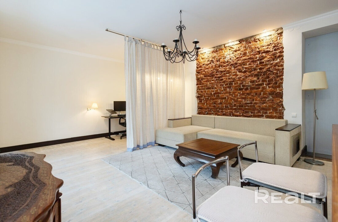 Площадь кухни-гостиной — почти 35 квадратов. Там есть обустроенная кухонная зона, зона отдыха и рабочее место. Обратите внимание, что во время ремонта оголили часть оригинальной кирпичной кладки (получилось симпатично).