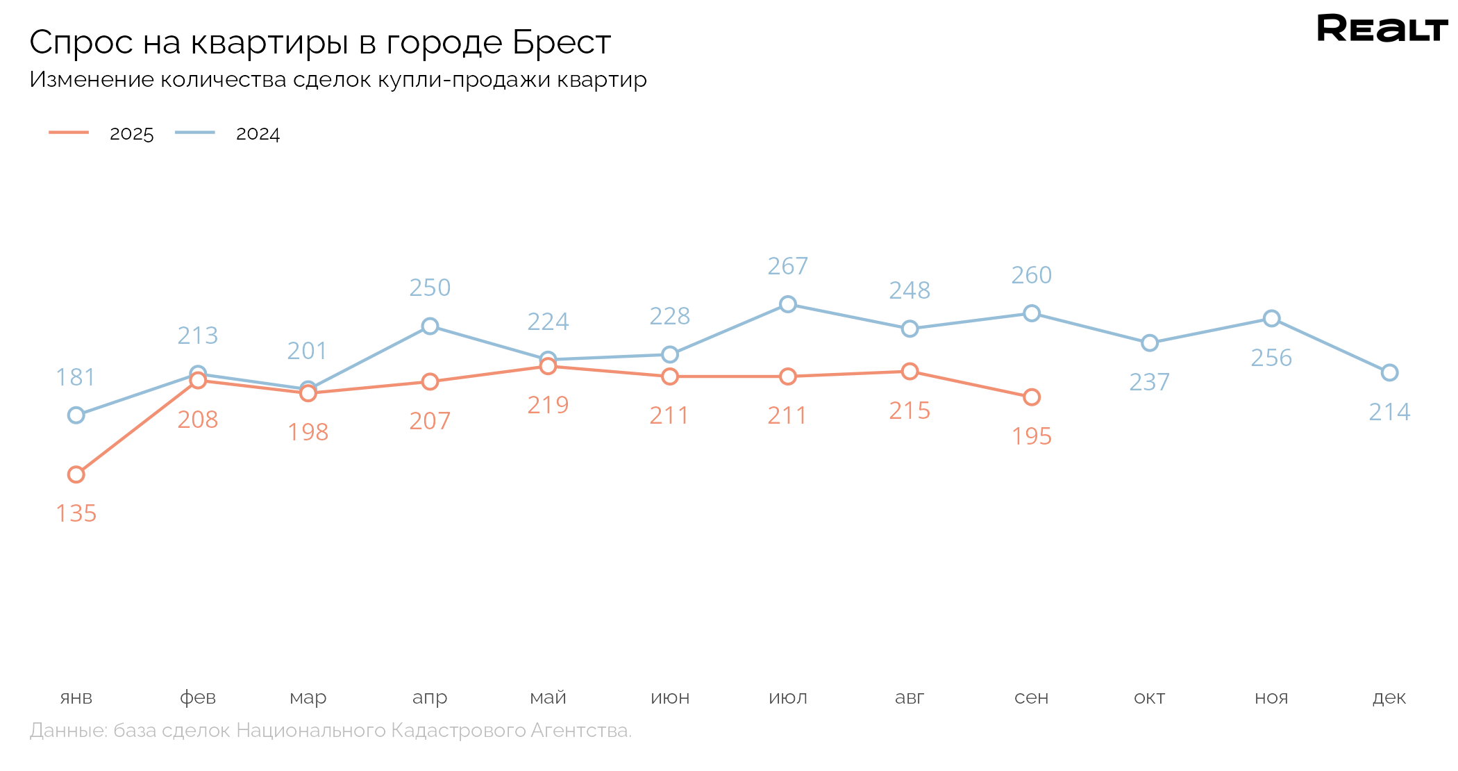 За сентябрь в Бресте заключили 195 сделок купли-продажи квартир, что на 9.3% меньше, чем в предыдущем месяце. По сравнению с аналогичным месяцем прошлого года спрос на квартиры уменьшился на 25.0%.