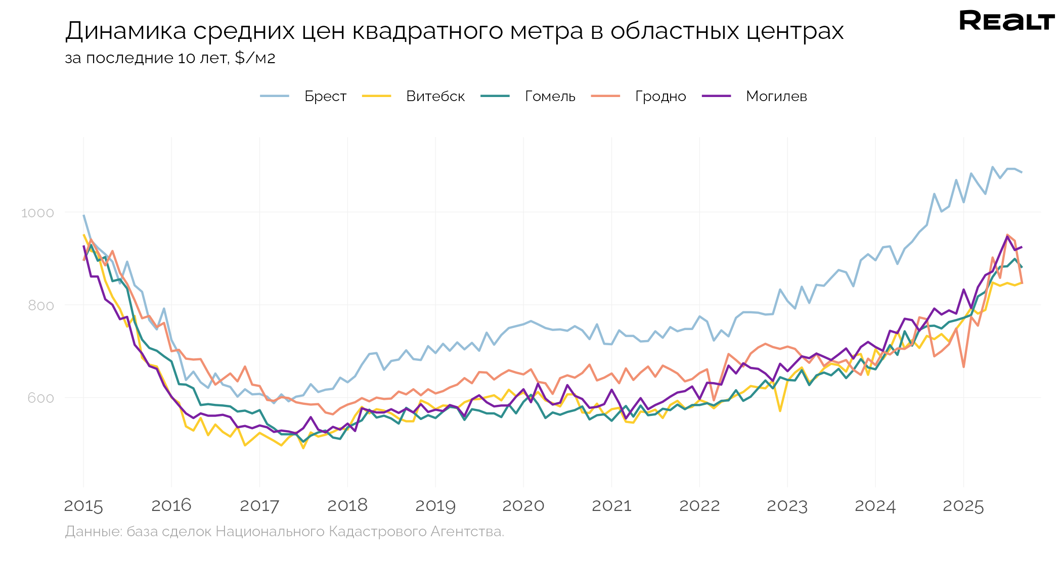 Средняя цена квадратного метра квартир в Бресте в сделках за месяц снизилась на 0.7% и составила 1085 $/м2. Текущий уровень цен на 4.4% выше, чем в аналогичный период прошлого года.