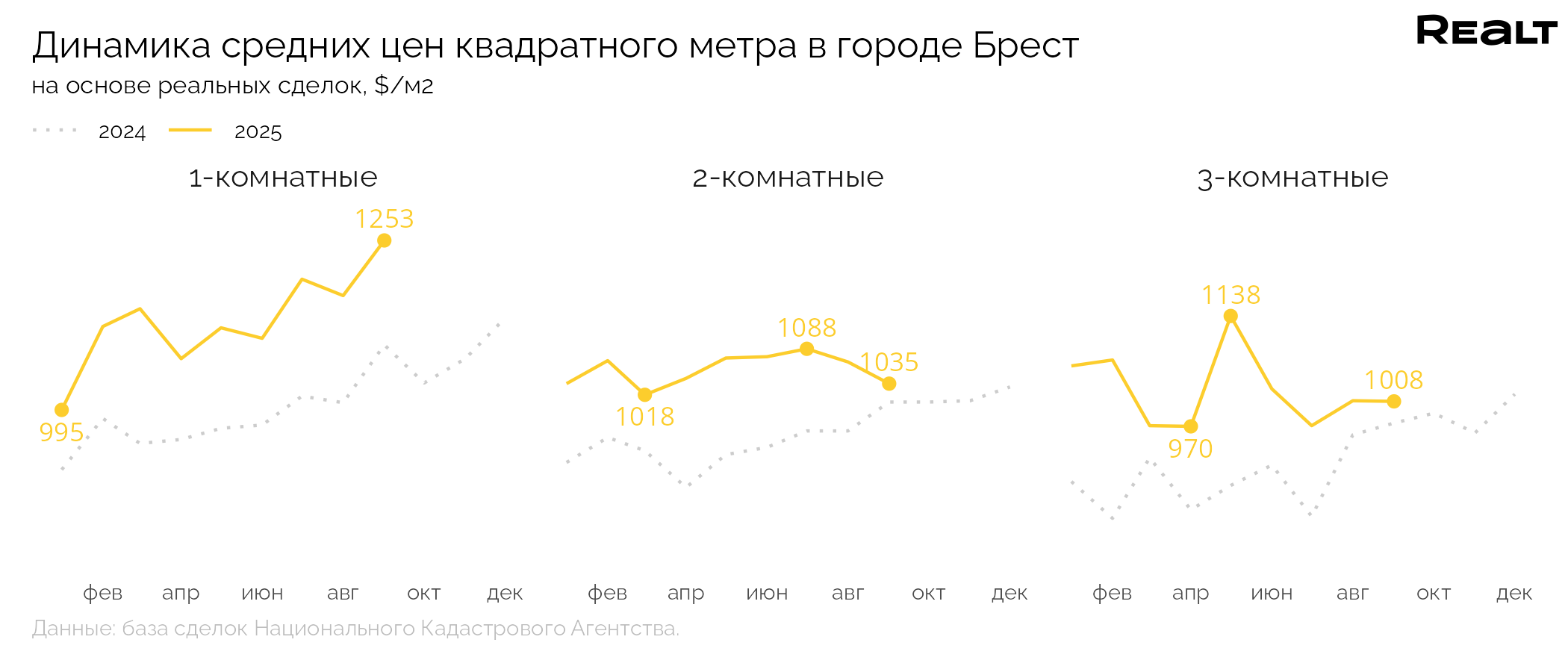 По данным сделок средняя цена квадратного метра 1-комнатных квартир, которые на данный момент продаются в среднем по 1253 $/м2, увеличилась на 7.2%. Средняя стоимость 2-комнатных квартир в Бресте составляет 1035 $/м2 (-3.1% за месяц). 3-комнатные квартиры продавали в среднем за 1008 $/м2 (-0.1% за месяц).