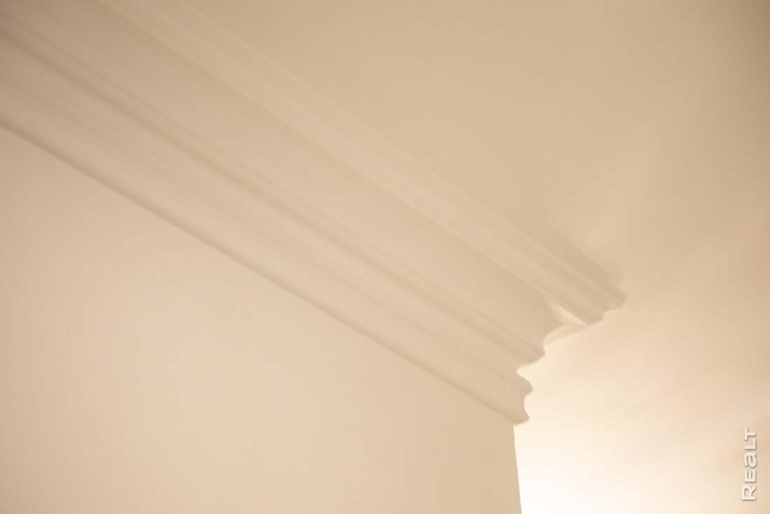 Самая долгая работа в квартире была связана с выравниванием потолков. Из-за слоев шпаклевки он потерял примерно 15 сантиметров, но результат того стоил. Сейчас его украшают новые розетки и плинтуса по периметру, что создают эффект лепнины.