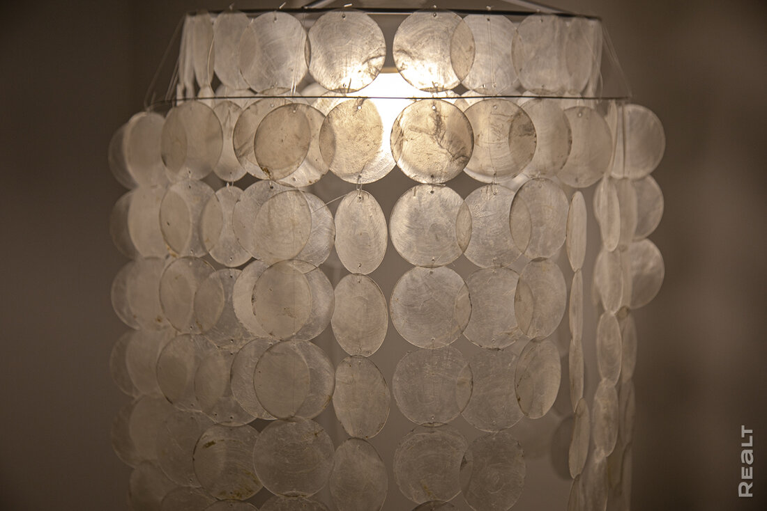 Несколько вещей Света сделала своими руками. В углу стоит торшер из ракушек и лески, на столе — ваза, отделанная художественной пастой.