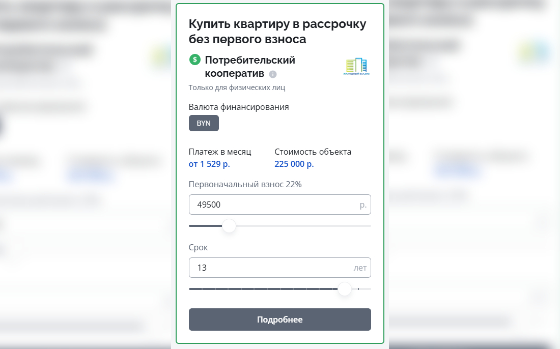 Отметим, что максимальная стоимость квартиры, с покупкой которой вам поможет потребительский кооператив, — 549 000 BYN для Минска (184,4 тыс. долларов по курсу на 04.11.2025); уточнить максимальную стоимость, в рамках которой возможна покупка в других городах, можно у специалистов офиса. Важно понимать: рассчитывая суммы и сроки, не стоит ориентироваться именно на ту квартиру, которая указана в объявлении. Дело в том, что даже за минимальное время накопительного этапа (7 месяцев) ее, скорее всего, продадут. Наш калькулятор работает для того, чтобы вы могли в целом узнать размеры и сроки платежей — и сориентироваться в своих возможностях.