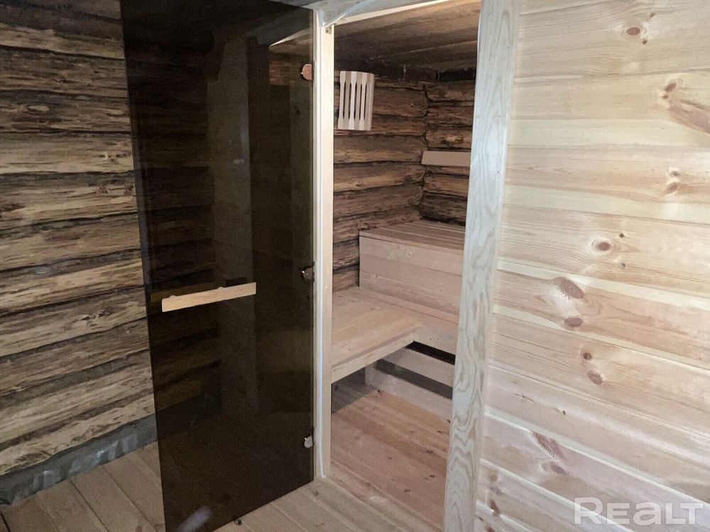 На участке с ландшафным дизайном имеется еще и банька! Внутри тоже сделан ремонт — стены почищены, полы новые, есть душевая, подведена вода. В парилку — стеклянная дверь.
