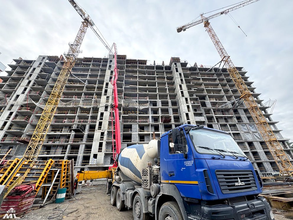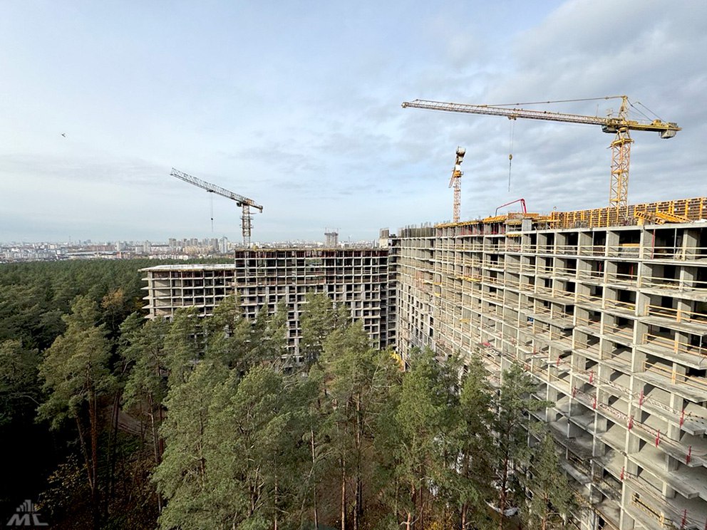 — Сегодня на объекте принимают бетон на перекрытие 14-го этажа первых двух секций. Следующие три секции будут 16-этажными. Далее этажность станет снижаться: 14 и 12 этажей. Такая компоновка облегчает восприятие и гармонично сочетается с природным ландшафтом, — рассказывают в «Минскстрое». — Параллельно с монолитчиками вверх идут каменщики (они уже на шестом): заполняют наружные стены и кладут перегородки.